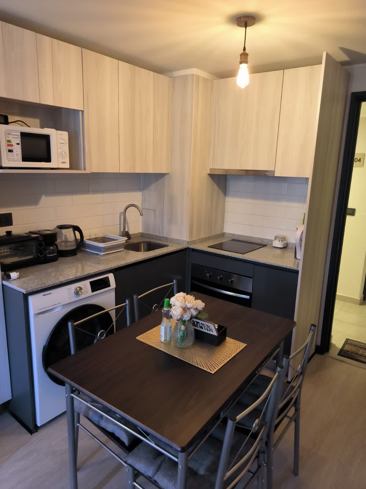 Ideal para estadías por trabajo, estudios o tratamientos de salud. Un espacio cómodo y funcional, perfecto para 2 personas. Departamento de 34 m² que dispone de 1 dormitorio con cama de dos plazas, cocina equipada con todo lo necesario para tu estadía (incluye lavadora–secadora). ✔ Cercano a Metro ✔ Wifi de alta velocidad ✔ Cocina equipada ✔ Edificio con piscina, gimnasio, área de coworking con wifi y conserjería 24/7 ✔ Ubicación estratégica, cercano a Clínica Bupa, mall y estación de metro
