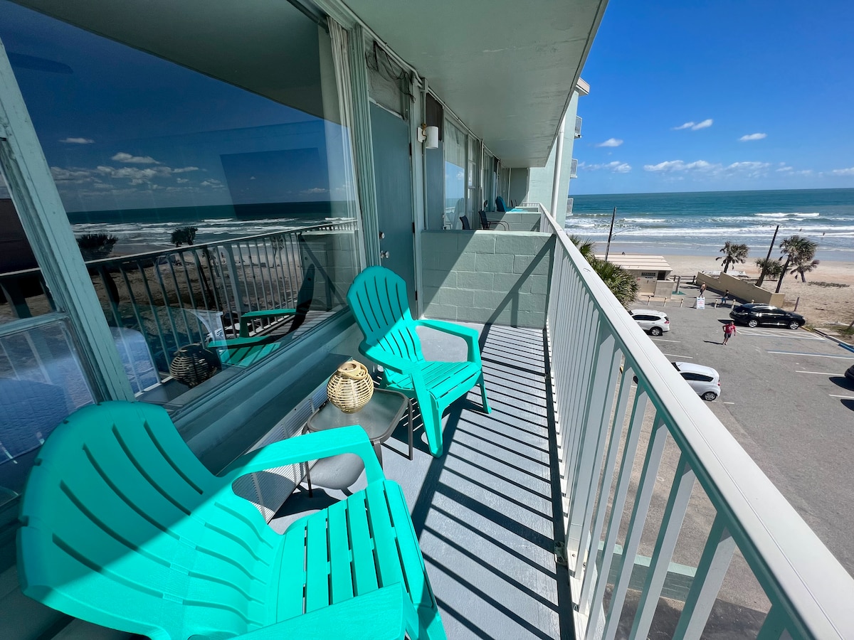 *** ¡La nueva piscina y el acceso a la playa están abiertos!*** ¡Te damos la bienvenida a Daytona Beach Bliss! Disfruta de nuestro estudio recién renovado a pocos pasos de la playa. Ubicado en Daytona Beach Club, este acogedor estudio tiene capacidad para 4 personas con una cama tamaño queen y un sofá cama. El espacio es el más adecuado para 2 adultos o una familia con 2 adultos y 1-2 niños. El balcón del quinto piso tiene una hermosa vista lateral al mar y a la ciudad.