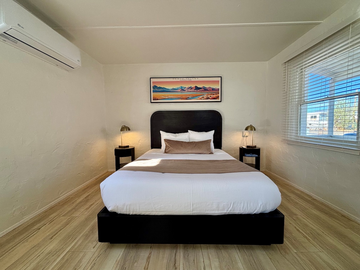 Alójate en uno de nuestros acogedores remolques glamping en Tarantula Ranch, a las afueras del Parque Nacional del Valle de la Muerte. Disfruta de impresionantes amaneceres, puestas de sol y cielos estrellados con vistas a nuestro pequeño viñedo. Cada caravana cuenta con una cama tamaño queen con sábanas, electricidad, aire acondicionado/calefacción, wifi y asientos al aire libre. Los servicios compartidos incluyen inodoros de compostaje, baños con inodoros y ducha, una cocina al aire libre, fogatas y un edificio comunitario con juegos. ¡Perfecto para una escapada tranquila por el desierto mientras exploras las maravillas del Valle de la Muerte!