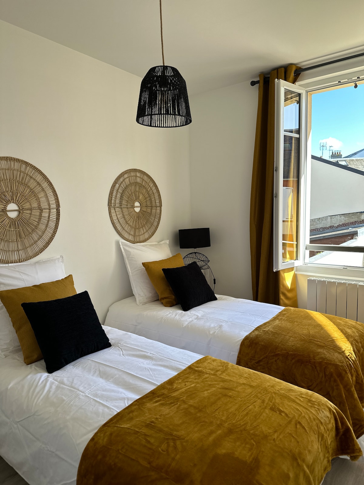 ¡Escápate a nuestro radiante apartamento dúplex ubicado en el corazón de Deauville! Completamente renovado en noviembre, disfruta de este encantador apartamento de 40 m² bien equipado que cuenta con 2 dormitorios con baño privado y una exquisita sala de estar con cocina abierta y hermosas vistas. Este dúplex muy tranquilo en la planta superior está bañado por luz natural y ofrece un espacio de vida tranquilo y elegante para un máximo de 4 huéspedes. ** Ubicación** Estación de tren: 350 m - 4 minutos a pie Place Morny: 230 m - 2 minutos a pie Playa: 900 m - 10 minutos a pie No se permite fumar ni traer animales.