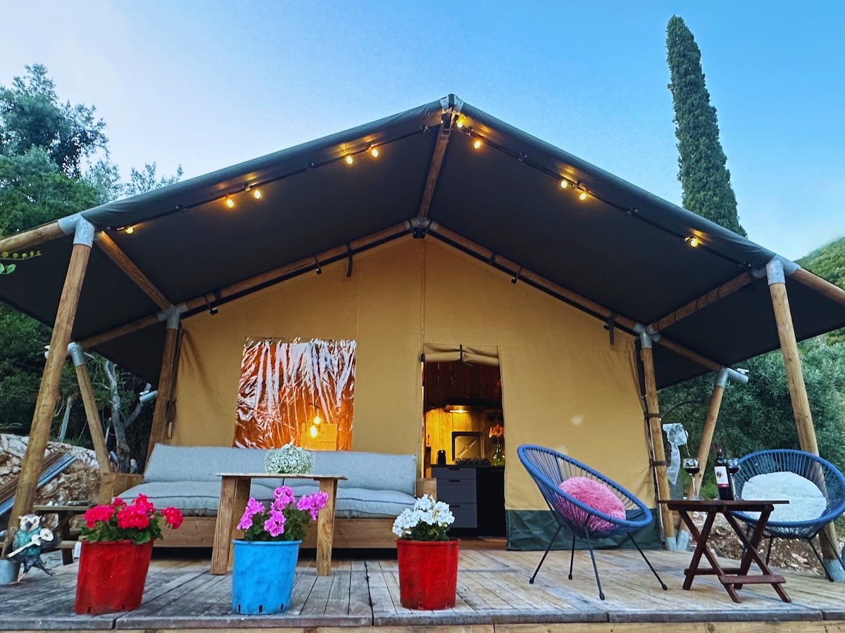 This special canvas lodge is hidden between the olive trees and is ideal for couples as it has a double bed, a private porch with a swing where you can enjoy a glass of wine , a luxurious indoor bathroom equipped with all amenities and hot water, kitchen , portable airconditioning and wi-fi.