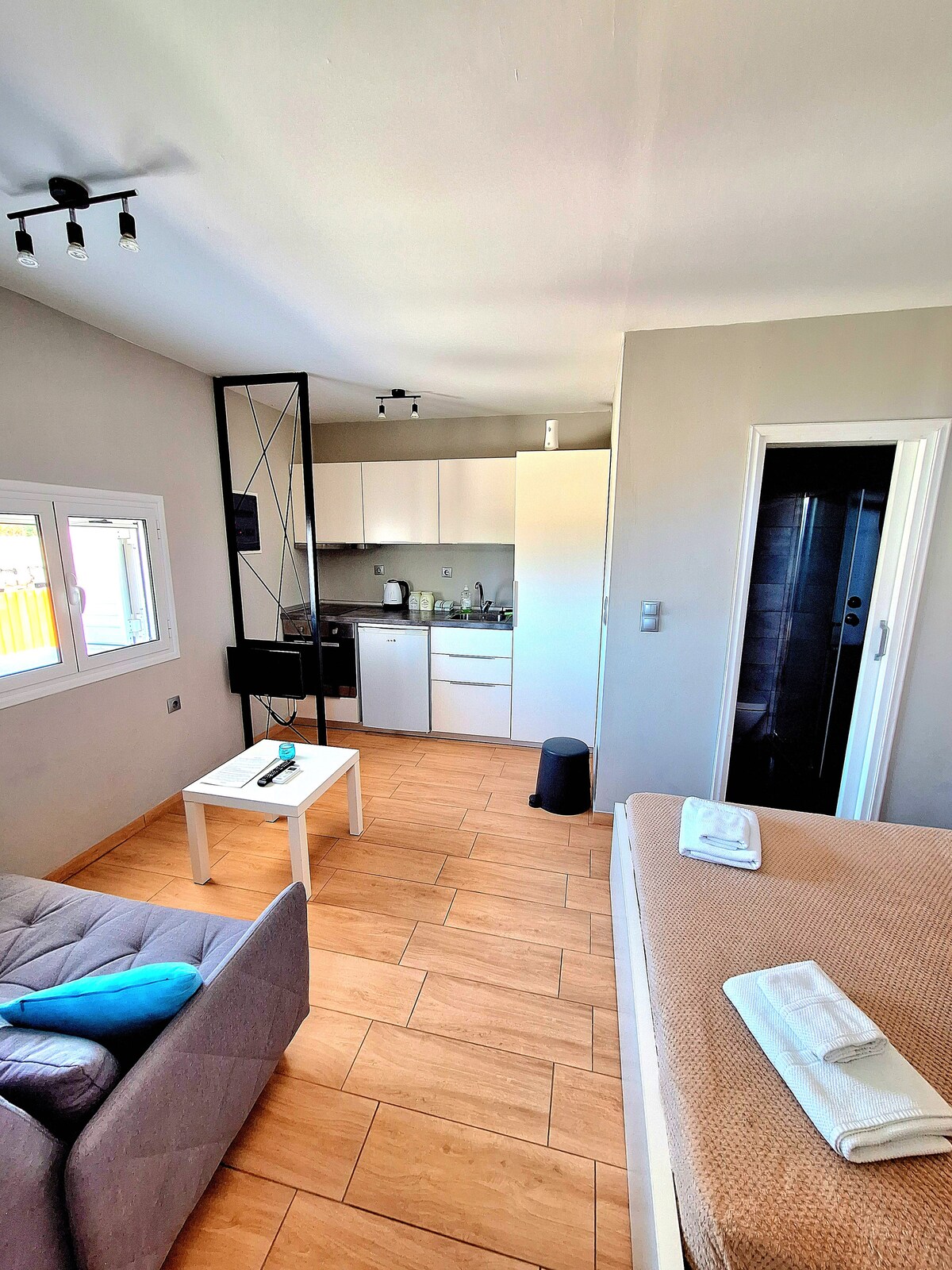 A warm and cozy space with charming wooden details, ideal for couples, families with children, or up to four friends. The open-plan layout includes a king-sized bed and a sofa that converts into a bed. Located in a quiet neighborhood, just minutes from the city center, airport, and central bus station. A large market (Jumbo), a supermarket, and a bus stop with routes to the center every 20 minutes are all within walking distance.