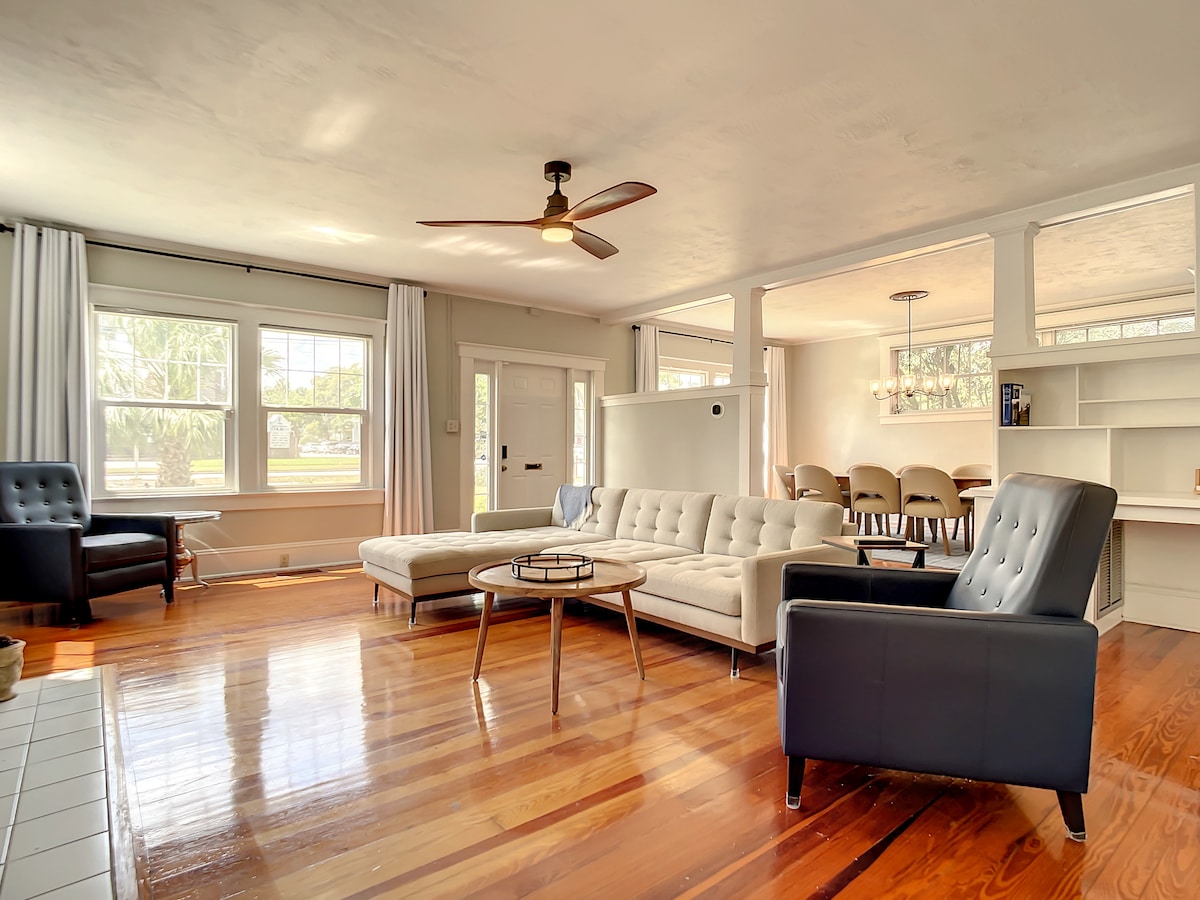 ¡Bienvenido! Esta casa fue construida en 1920 y ha sido restaurada maravillosamente. ¡Está a tres manzanas del centro de Deland! Camina o da un paseo rápido en bicicleta a restaurantes y tiendas. ¡Es una casa grande de dos pisos (223 metros cuadrados)! ¡Tenis de mesa, hockey de aire, futbolín, mesa de damas/ajedrez, cornhole, 4 bicicletas incluidas, enorme porche delantero para ver a la gente, gran chimenea de gas natural, parrilla, aro de baloncesto y mucho más! ¡La habitación de arriba también tiene su propia sala de estar independiente! ¡No hay nada que se le compare!