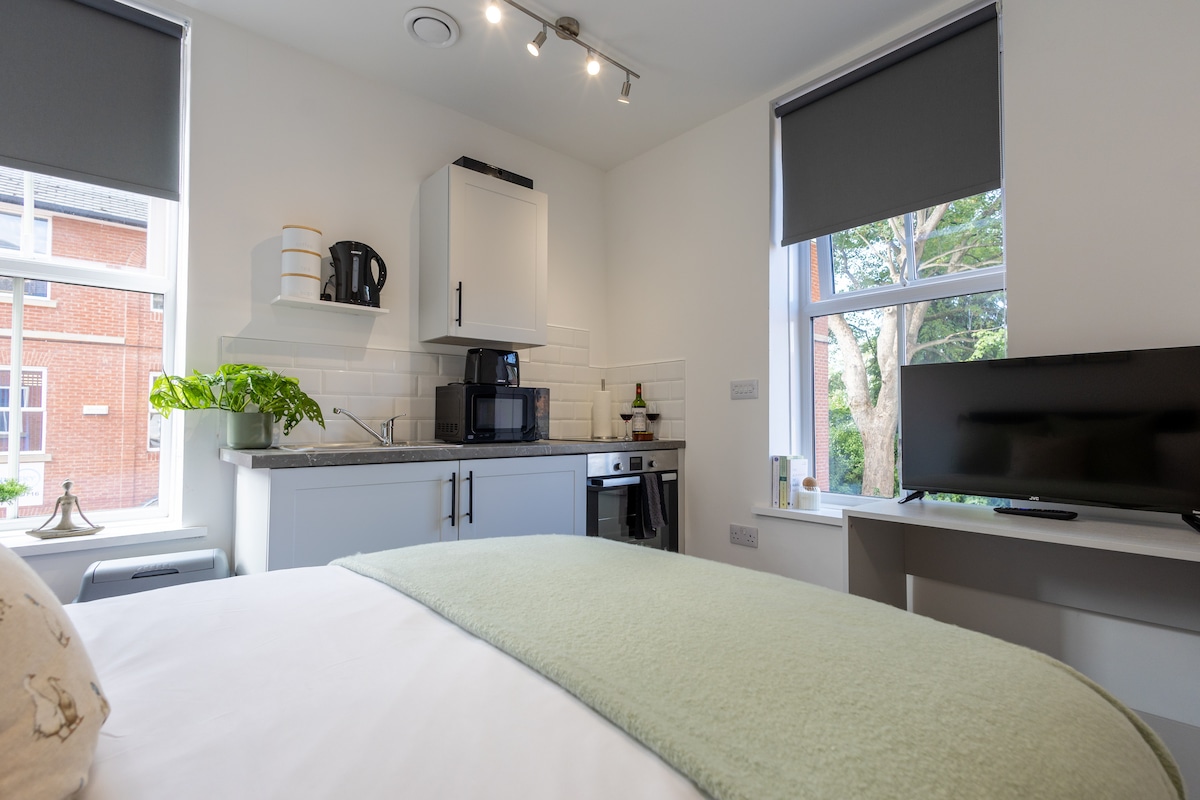 Elegante apartamento tipo estudio en el corazón de Derby, perfecto para el trabajo o el ocio. Este espacio independiente cuenta con • Una cocina pequeña totalmente equipada con vitrocerámica, horno, microondas, tostadora, hervidor de agua y todo lo esencial. • Una acogedora cama doble con sábanas suaves y cojines lujosos. • Un moderno baño privado con ducha a ras de suelo. • Televisión inteligente - Wifi superrápido. Estacionamiento privado a 3 minutos a pie de tiendas, bares, restaurantes y conexiones de transporte. Una base práctica para tu alojamiento en la ciudad