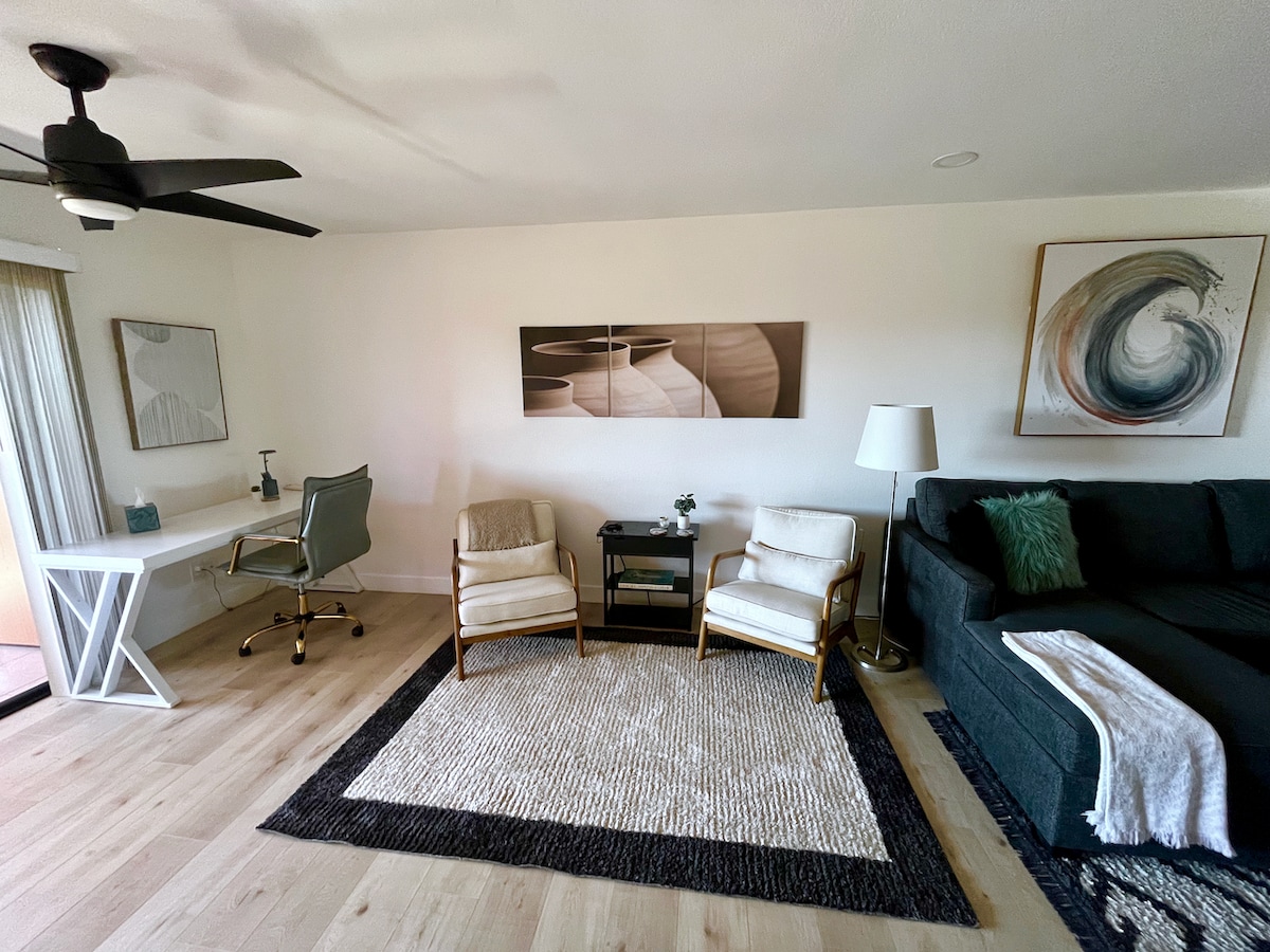 The Space: Welcome to Palm Paradise, your relaxing retreat in the heart of Old Town Scottsdale. renovated in October 2024, this condo blends stylish desert-boho design with all the comforts of home, creating a space that is both beautiful and functional. Unwind on the cozy green corduroy sectional, perfect for napping, or step out onto the private balcony to witness spectacular sunset views over Camelback Mountain. Step into the tranquil bedroom with a king-sized bed and high quality linens.
