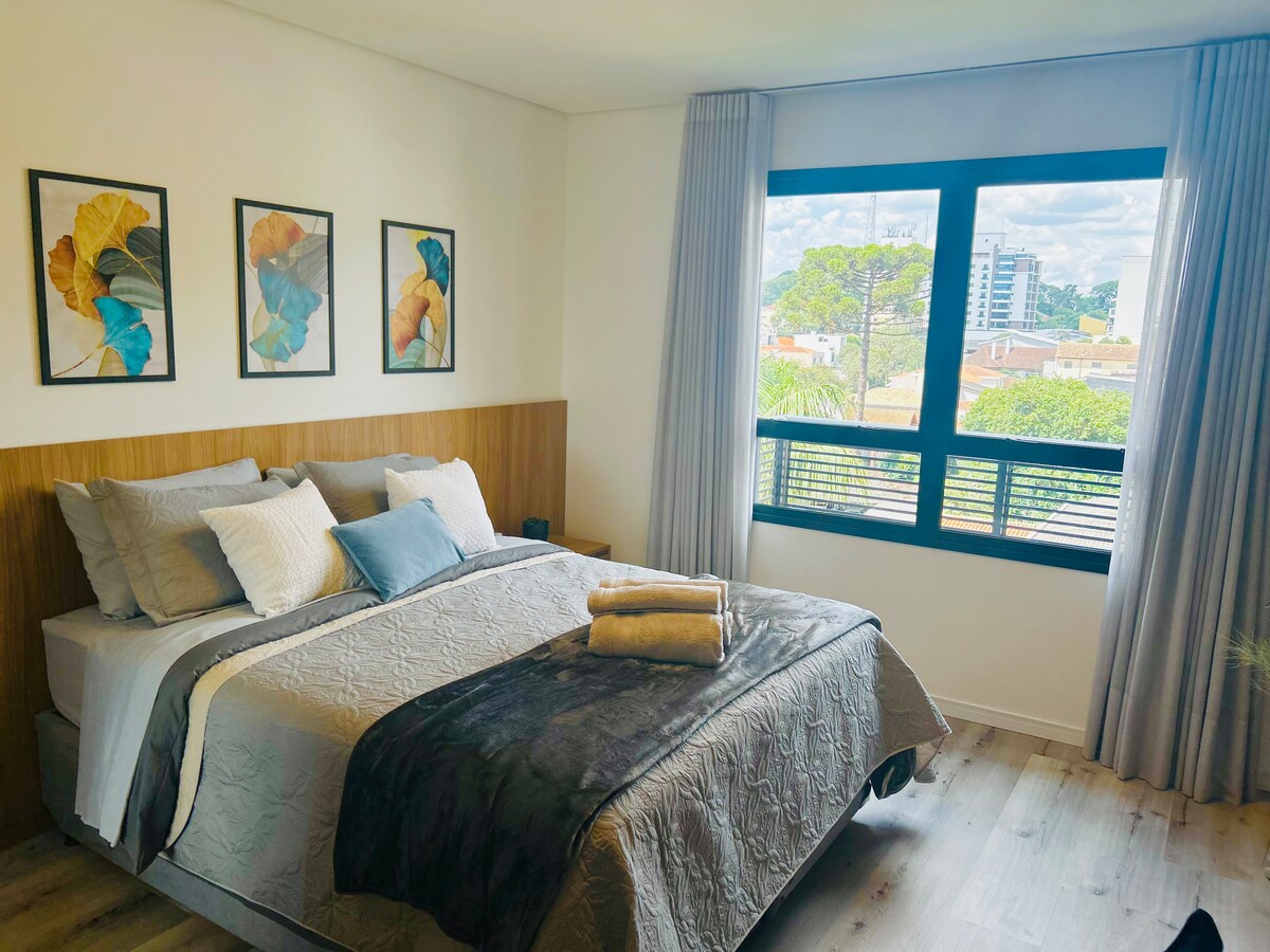 Relájese en este espacio tranquilo y elegante. Apartamento finamente decorado y totalmente equipado con vajilla, ropa de cama y toallas, listo para alojarse. El apartamento cuenta con: 1 habitación doble amueblada y equipada con TV 1 baño con ducha blindex 1 sala amueblada Cocina amueblada y equipada 2 balcones, uno de los cuales da a la calle. Plaza de estacionamiento cubierta Próximo: BR 116 - 300 M Jardín botánico - 800 M Centro de Curitiba - 5 km