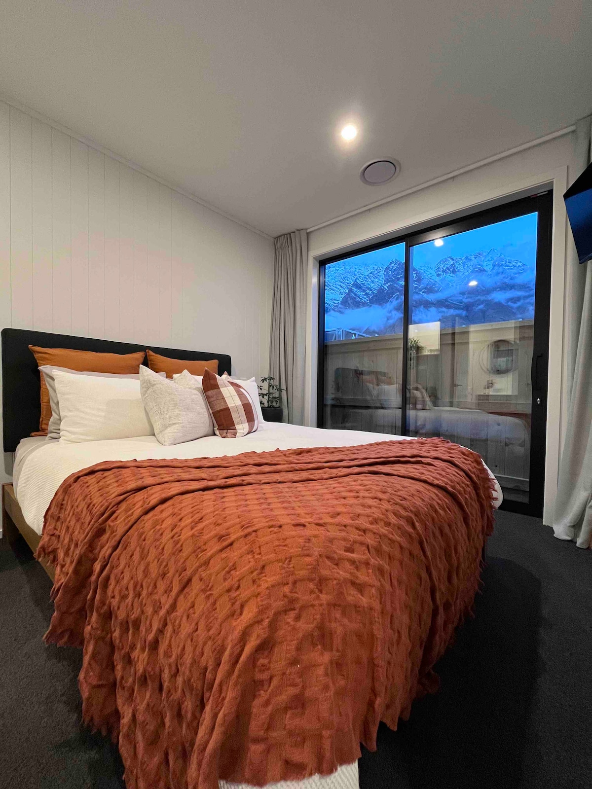 ¡Relájate y desconecta en este alojamiento tranquilo, silencioso y elegante después de un día lleno de actividades en Queenstown! Nuestra habitación con baño es el lugar perfecto para relajarse después de disfrutar de la cena en algunos de los mejores restaurantes que Nueva Zelanda tiene para ofrecer. La habitación con baño está unida a nuestra casa, con magníficas vistas a la cordillera de las Remarkables, calefacción central, baño privado, tetera/cafetera, totalmente independiente y con su propia entrada independiente para una privacidad completa.