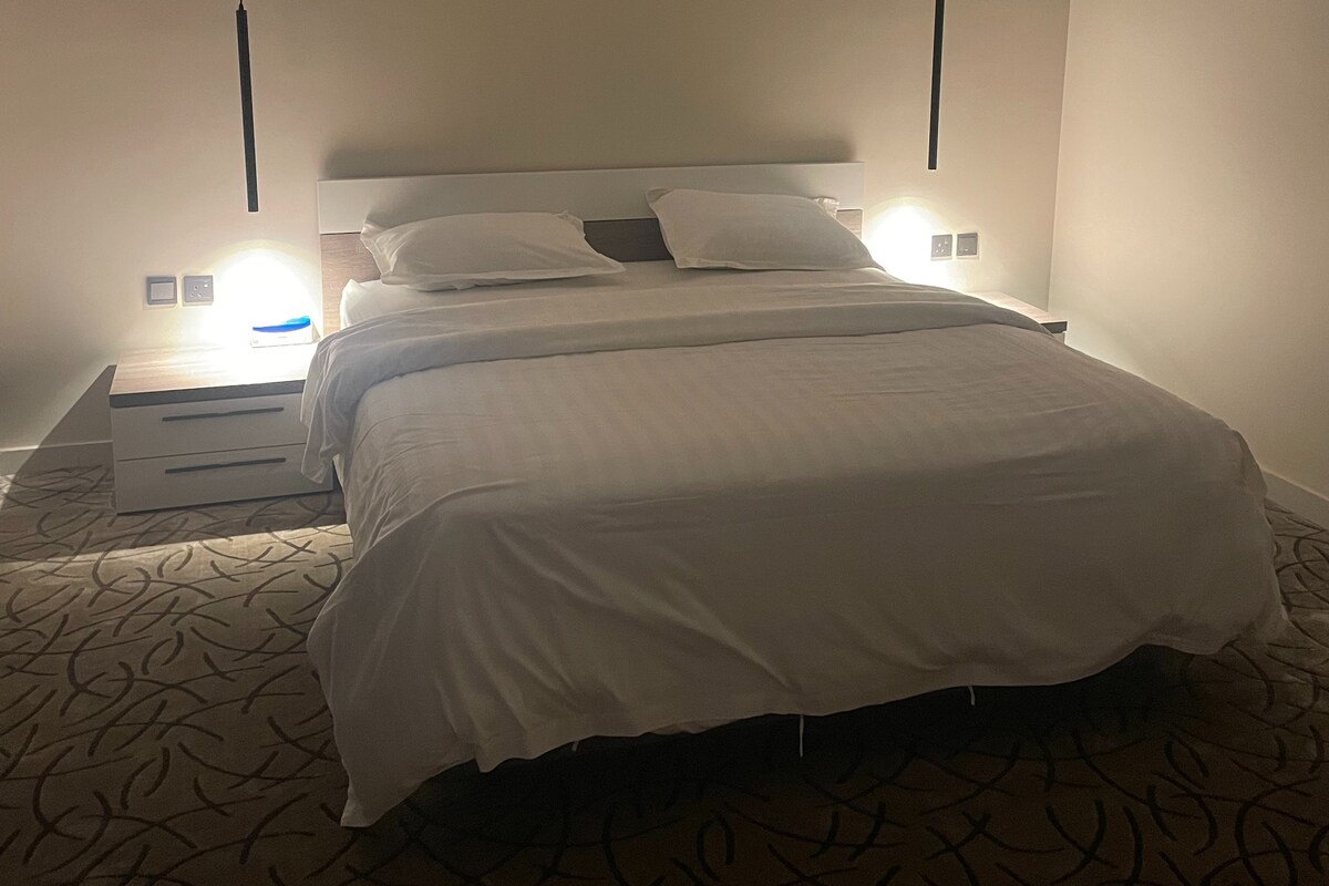 Bienvenido a nuestro apartamento, que le ofrece una estancia excepcional que supera sus expectativas. El apartamento tiene un dormitorio equipado con los mejores colchones, además de un salón separado con cómodos sofás y una pantalla inteligente de 65 pulgadas para disfrutar (Netflix, Shahid, BeIN) + wifi. La cocina está totalmente equipada para satisfacer todas tus necesidades. Hay una zona exterior con un diseño rústico y una vista privilegiada del centro financiero, ideal para celebrar eventos y reuniones con familiares y amigos. El apartamento está equipado para estancias cortas y largas. La ubicación es fantástica, en el corazón de la ciudad, cerca de lugares de interés, servicios y restaurantes.