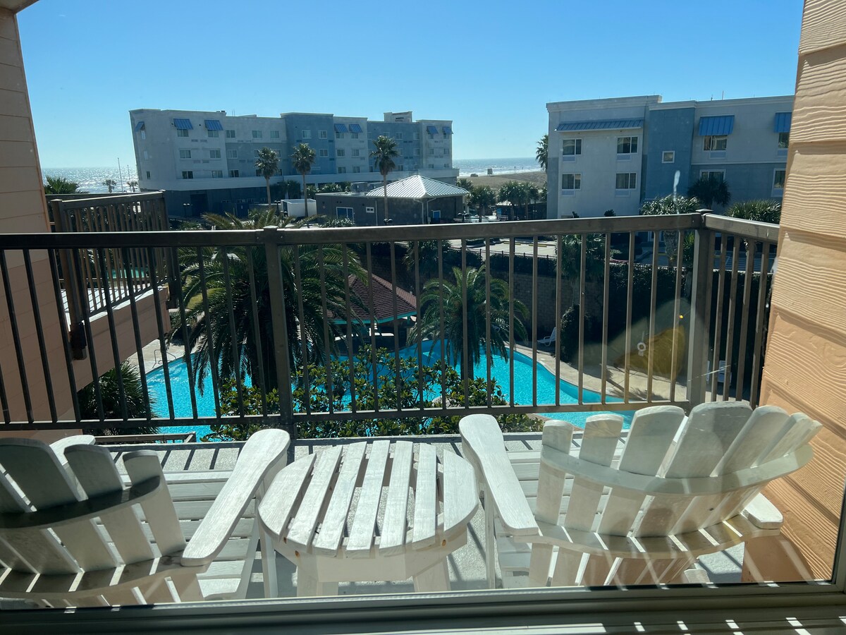 Recién remodelado con un acogedor ambiente de casa de playa. Mi apartamento está EN LA PLAYA. No cruces la concurrida carretera con tu familia. Capacidad para 6 personas. Cama tamaño queen ajustable y sofá cama tamaño queen con 2 literas. Cocina nueva, 2 televisores de pantalla plana. Wifi gratuito y Netflix. El complejo cuenta con una gran piscina tropical climatizada con 3 bañeras de hidromasaje. Acceso privado a la piscina y la playa. La propiedad es una comunidad cerrada con seguridad. Una caja fuerte para guardar tus objetos de valor es gratuita para tu uso. A 10 minutos de Moody Gardens o Pleasure Pier. Rampas para discapacitados.