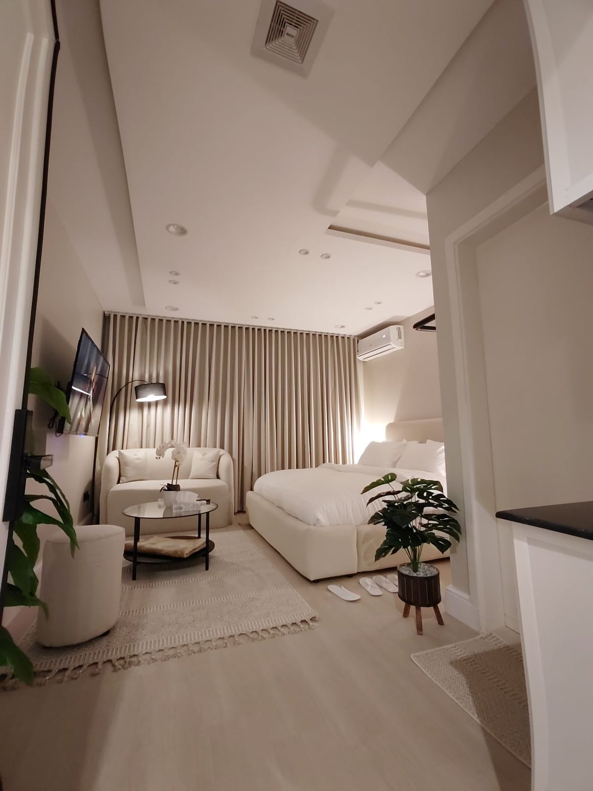 Suite Real 🏨 Ubicación: Distrito de Hittin | Riad 📍 Ubicación privilegiada: cerca de todos los servicios y eventos. 🛍️🎢 Plaza Saad: 3 min Riad Boulevard: 5 minutos. Valle de Laysen: 10 minutos. Distrito financiero: 15 minutos. Parque Riad: 13 min. Aeropuerto: 17 min. Composición de la suite: Habitación + sala de estar + cocina + baño Servicios: Televisor de 85 pulgadas, cómodos sofás. Baño totalmente abastecido: jabón, champú, acondicionador, cepillo de dientes. Iluminación ajustable. Nevera, tetera, microondas.