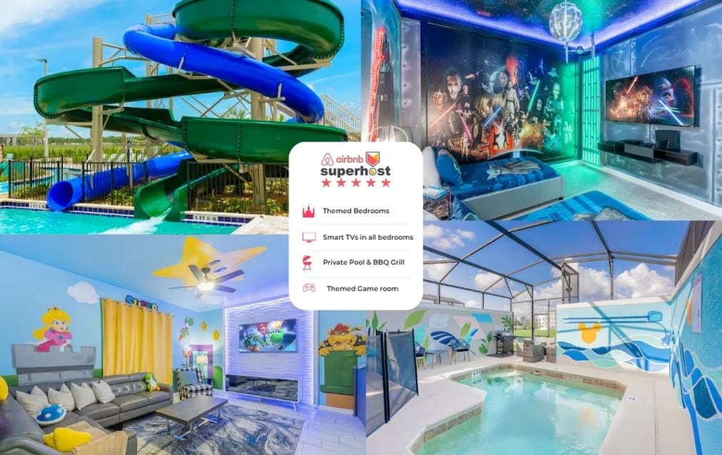 Piscina privada, 5 dormitorios, casa adosada con habitación temática cerca de Disney