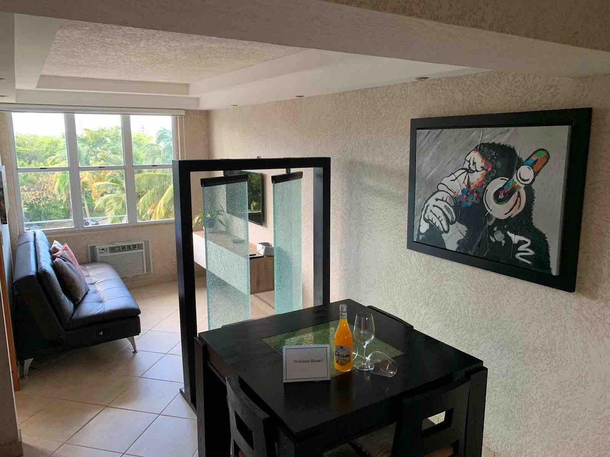 Located in Miramar, walking distance to PR Convention Center, T-Mobil District, Restaurants, Hotels , Bars, Supermarkets, Movie Theater, Casino, Marina, Beaches (Condado and Escambron), and Isla Grande Airport. *Please note that there is a Construction next to the building that can be noisy during day time. *Pet allowed with prior consent, $15 extra fee x pet. No cats. *Reservations for two sleeping separately need to add a third guest so sofa bed is prepared. This is to cover our extra costs.