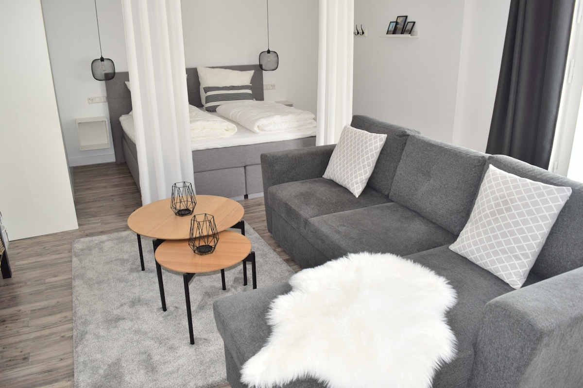 Bienvenido a mi apartamento, GreyPearl. Este apartamento de 45 m² recién renovado y de alta calidad ofrece todo lo necesario para una estancia relajante y activa en Büsum: Cama → tamaño king Televisión → inteligente y Netflix tanto en la sala de estar como en el dormitorio. Máquina de café→ nesspreso Cocina → moderna. → Terraza con asientos → A poca distancia a pie del centro de la ciudad y a solo 300 metros de la laguna Perlebucht. Ropa de→ cama y toallas incluidas. Plaza de→ aparcamiento disponible.