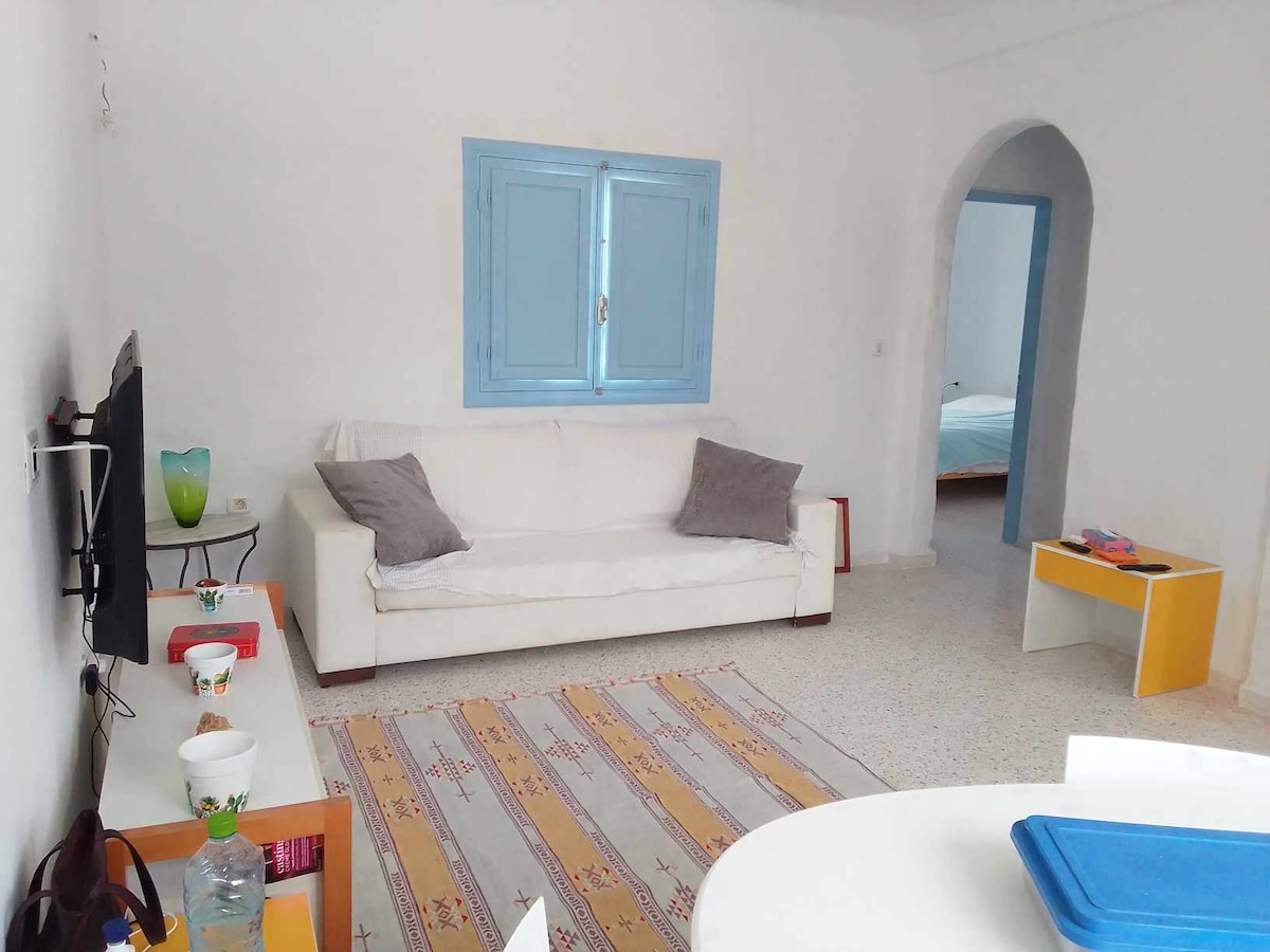 Un apartamento independiente en toda una residencia no muy lejos de la laguna Djerba. este apartamento consta de una sala de estar, cocina, cuarto de baño en la planta baja y un dormitorio en el piso de arriba. El jardín es compartido con otros viajeros.