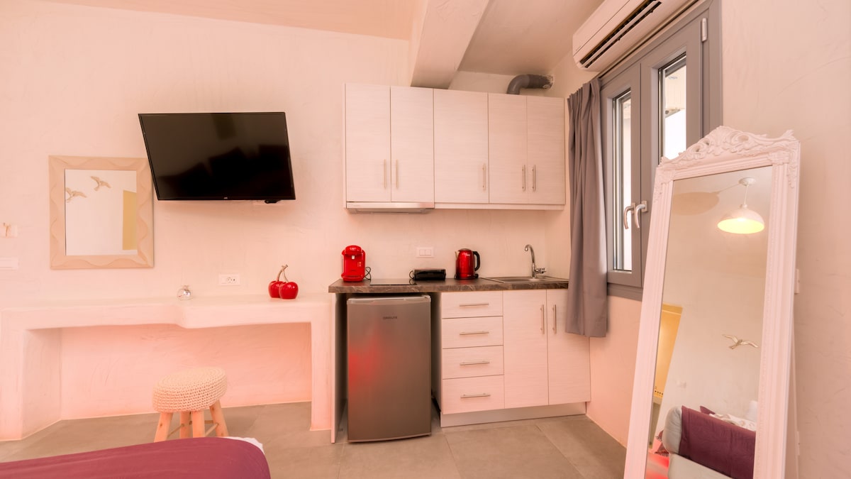 Una romántica suite de primer nivel, jacuzzi privado al aire libre limpio y climatizado con vistas al mar, diseño interior tradicional, TV, aire acondicionado, nevera, wifi, microondas, cocina totalmente equipada, baño espacioso y servicio de traslado gratuito desde y hacia el aeropuerto. Te ayudamos a organizar todas tus actividades y alquileres. Ofrecemos almacenamiento gratuito de equipaje. Estamos ubicados en el centro, junto a estaciones de autobuses, supermercados y restaurantes locales. A solo 3 km de Thira, a 2 km del aeropuerto y a 3 km de la playa. Oia está a solo 12 minutos.