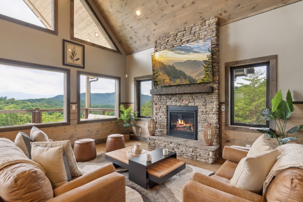 Escape to Snoring Bear, a stunning 3-level cabin with breathtaking views of the Smokies and Pigeon Forge! Located behind Dollywood, you can hear the train and watch fireworks from the fire pit. Perfectly located near top attractions yet tucked away for a peaceful retreat.Sip your morning coffee on the deck, soak in the scenery, and enjoy a complimentary bottle of wine on 3+ night stays Must be 24+ to book. No pets allowed. Book now for unforgettable mountain memories! Follow@snoringbear_cabins