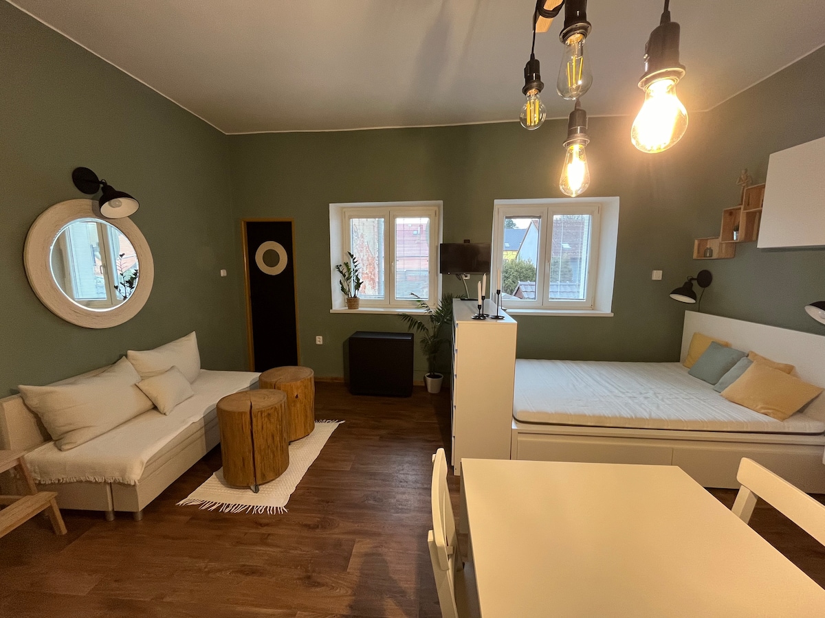Unsere große Ferienwohnung liegt auf dem historischen Mühlenhof Vodolenka – mitten in der Natur, absolut ruhig und perfekt für alle, die Erholung suchen. Auf ca. 100 m² gibt’s Platz für bis zu 5 Personen, mit Kamin, Sauna und Whirlpool zum Entspannen. Das Highlight: Rotwild direkt vorm Fenster, viele liebe Hoftiere, ein eigener Angelteich, Grillmöglichkeit im Garten und kostenlose Leihfahrräder. Ideal für Familien, Naturfans und alle, die einfach mal durchatmen wollen.