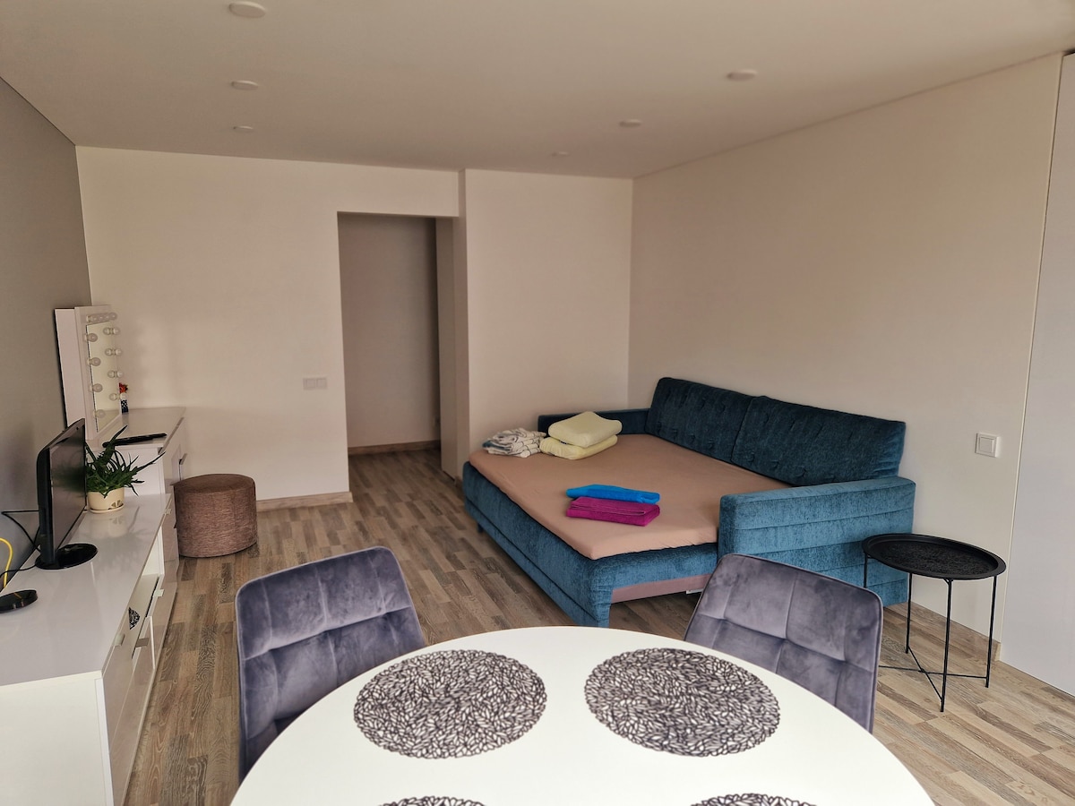 Apartamento nuevo en un edificio de apartamentos a estrenar :) Ofrece todas las comodidades para que los huéspedes estén más cómodos, incluyendo toallas, cubiertos, wifi con TV/Go3, hervidor de agua, tostadora, etc., incluyendo aparcamiento gratuito y una cuna si es necesario. Siempre estoy aquí para dar la bienvenida a los huéspedes. Nemuno Street 27 está justo entre el castillo de Kaunas y Zalgirio Arena, lo que lo convierte en el punto central.