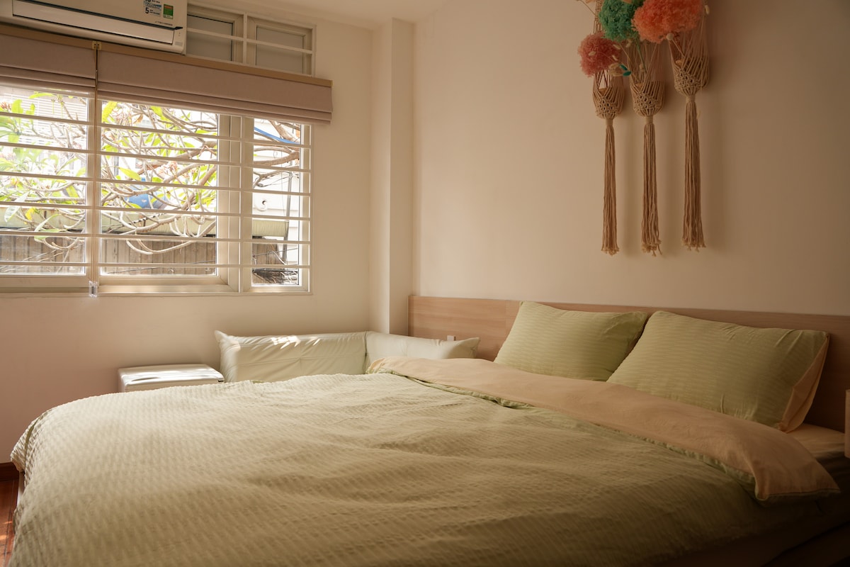 “Té verde y fruta del dragón roja y rosa”: belleza fresca dentro del departamento Big Studio (3.º piso, escaleras), centro del Distrito 1. Estudio grande de 45 m2, a poca distancia de Phong. Espacio limpio lleno de área de escritorio, TV grande y relajante, cocina, inodoro cerrado, balcón aireado. Lo más destacado es el sofá suave, el televisor Qled 4k y la vista verde del balcón. Horno y cocina eléctrica al aire libre. El tono verde del té, el color rosa maduro de la pitaya y la guayaba rosa son productos agrícolas populares en Vietnam. Lavadora secadora gratuita.