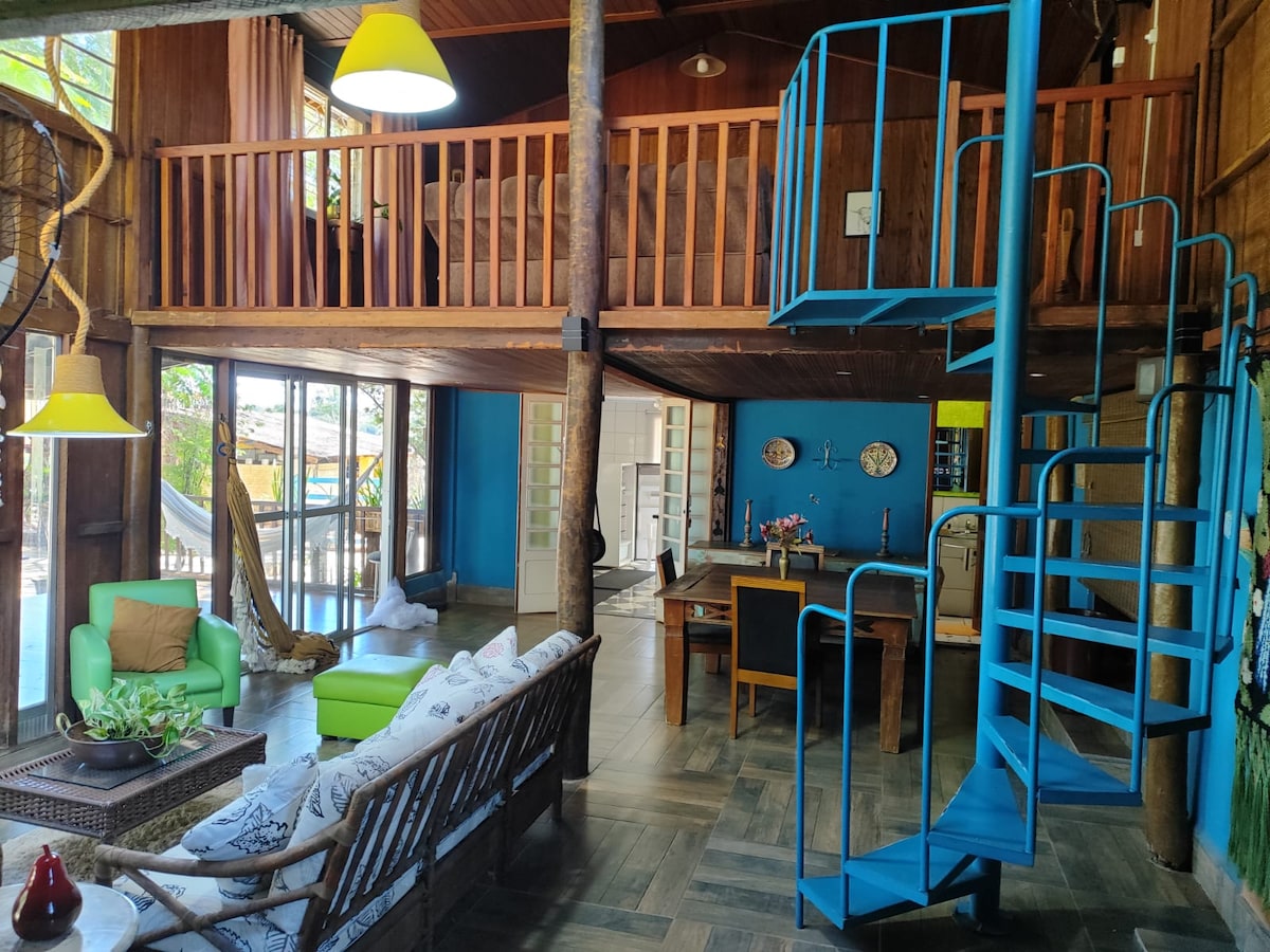 📸 @casaraomorrodosventos Casa de campo ampla, aconchegante e cercada pelo verde - Um refúgio exclusivo em plena natureza, ideal para relaxar e se desconectar! Desfrute de nossa infraestrutura: piscina com cascata, lago com tirolesa e caiaque, redes de descanso, cachoeira artificial, quadra de areia, área gourmet, horta orgânica, fogueira e firepit. Tudo isso em um cenário de beleza única, com vista privilegiada e um pôr do sol inesquecível,que pode ser apreciado de uma rêde panorâmica.🤎🌿