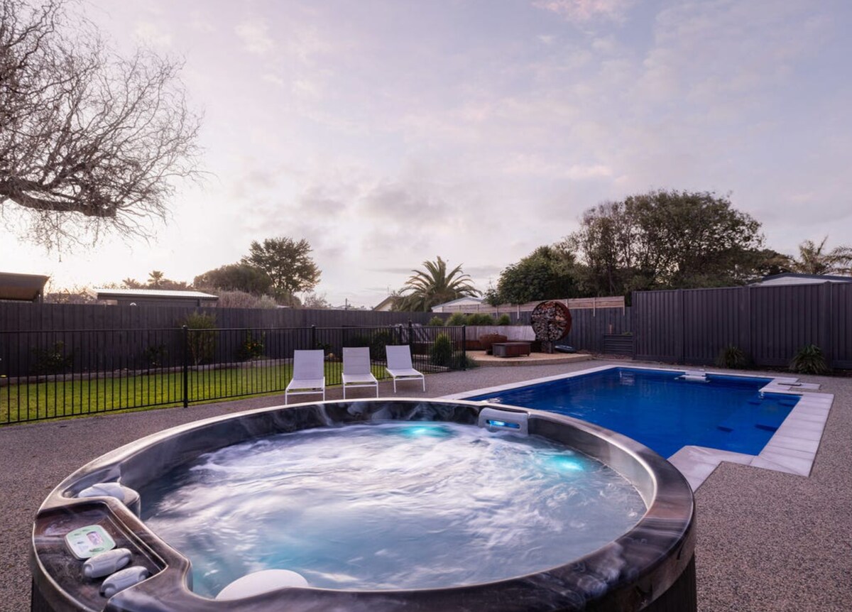 A refined coastal sanctuary for families, girls’ trips, golfers and couples seeking calm. Just moments from Peninsula Hot Springs, Alba Thermal Springs and for golfers, world-class golf courses. With the back beach and national park at the end of the road, this beautifully styled home offers four elegant bedrooms, lush greenery, luxurious linen and a heated pergola with outdoor cinema. Enjoy curated outdoor spaces, picnic basket, baby goods supplied, plus a fully fenced garden for furry friends