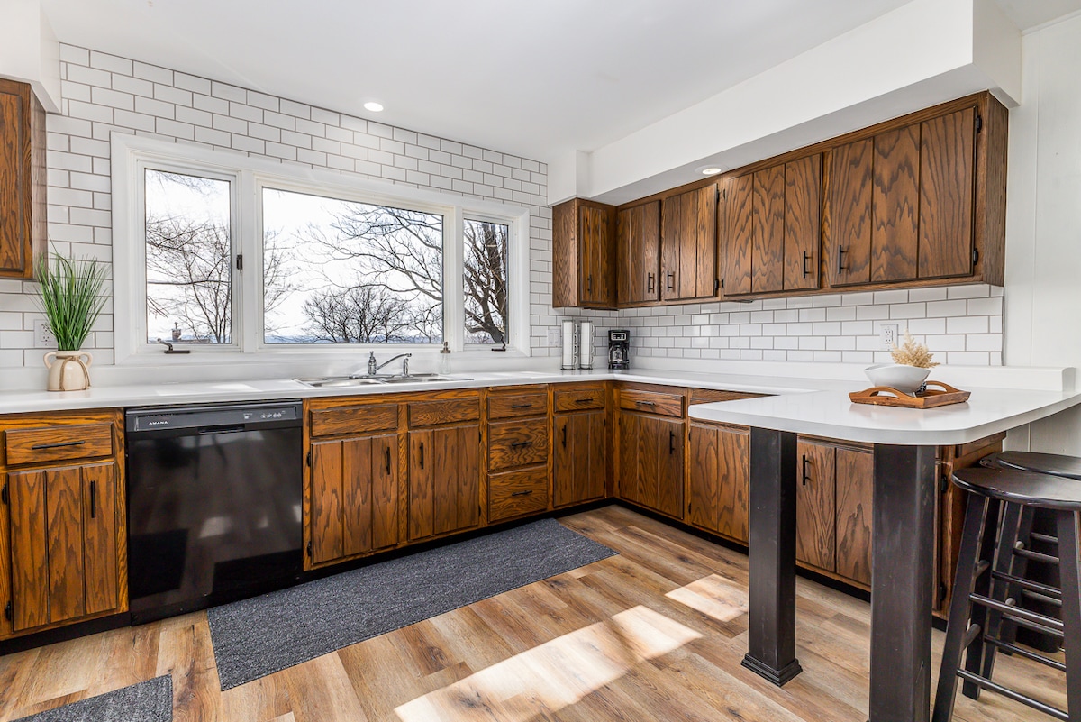 Ubicada en la cima de una colina, nuestra encantadora casa tiene una cocina amplia y bien equipada, 4 dormitorios, 1,5 baños, una chimenea acogedora y televisores inteligentes de 50 pulgadas en cada dormitorio. Disfrutá de las vistas del valle del río Mississippi durante los meses de invierno, primavera y otoño. Durante el verano, la vegetación crece demasiado. Fácil acceso al centro de la ciudad y al distrito de Millwork. Estacionamiento para 3-4 autos. El famoso Campo de los Sueños está a solo 40 minutos, Sundown Mountain está a 20 minutos.