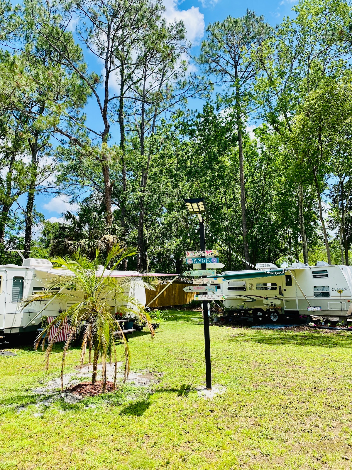 Un alojamiento romántico y sorprendente que no te quitarás de la cabeza. Un paraíso tranquilo y sereno, y un barrio limpio, tranquilo y seguro en el corazón de Orange Park. Los huéspedes estarán rodeados de paisajes al aire libre vívidos y limpios. El área de estacionamiento está indicada por la entrada, ya que conduce a una vibrante área de autocaravanas al aire libre. Esta autocaravana es perfecta para viajeros, estudiantes, parejas y mucho más. Estamos en el corazón de Orange Park. Estamos a 3 minutos de Blanding Blvd, que es la calle principal, por lo que puede haber ruido. Gracias.