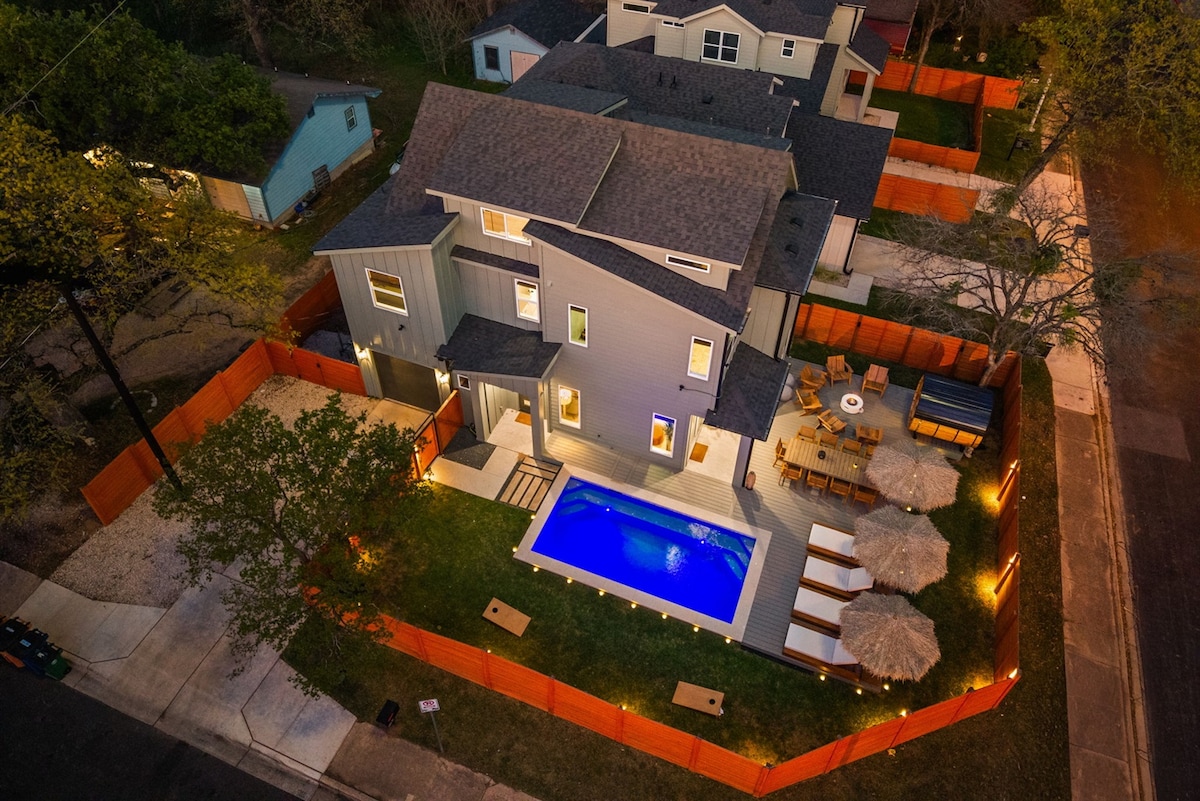 Paraíso de 5 dormitorios con piscina privada y jacuzzi a pocos minutos de la vida nocturna del centro. Relajate en dormitorios de diseño, cociná para todos en la cocina del chef y disfrutá del cielo de Texas. Pileta climatizada y jacuzzi Wifi rápido y espacio para trabajar Estacionamiento gratis para 4 autos Caminá hasta los tacos, el café y los bares de East Austin. ¡Los fines de semana de la semana se llenan rápido! Capacidad: 16 personas 5 dormitorios 4 baños 4 camas tamaño king 4 camas individuales extragrandes 4 camas simples Lugar para hacer fogata Piscina climatizada Jacuzzi Putting Green Cocina del chef Estación de trabajo dedicada Pelotón ¡Este es el lugar!