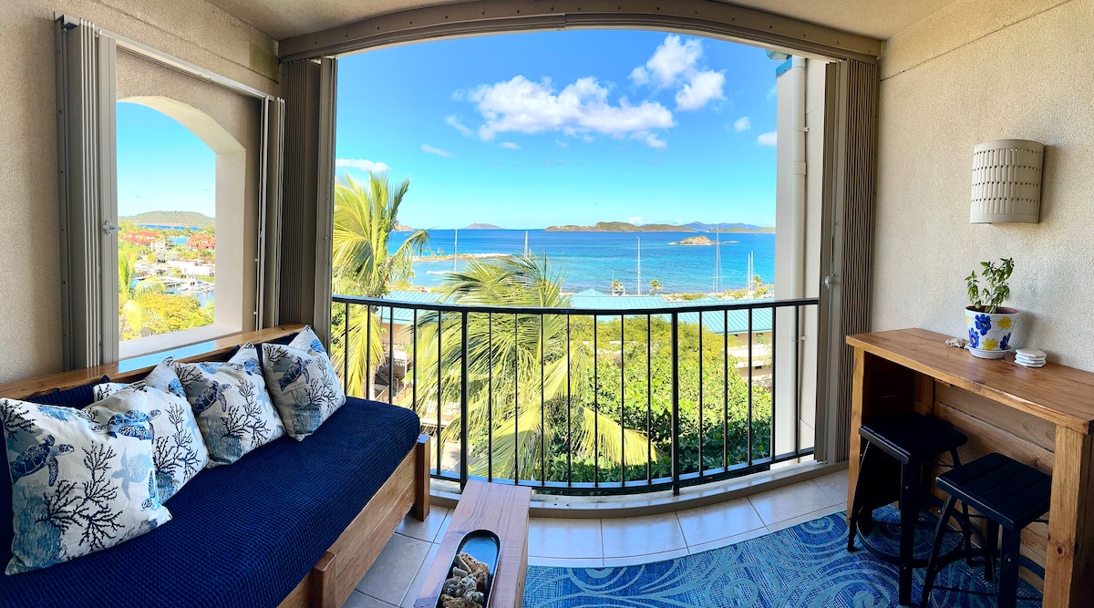 ¡Ubicado en Sapphire Beach Resort! ¡Vistas privilegiadas al mar y al puerto deportivo! Este condominio bellamente decorado y totalmente amueblado tiene capacidad para 4 personas. Disfruta de las hermosas vistas del puerto deportivo y de St. John desde el balcón privado. El condominio ofrece parrilla al aire libre, paquete de cable completo, aire acondicionado, WIFI y lujosa cama tamaño king y sofá cama tamaño queen. Si necesitas espacio adicional para amigos o familiares, tenemos otra propiedad en Sapphire Beach Resort y estaremos encantados de acomodar a tu grupo.