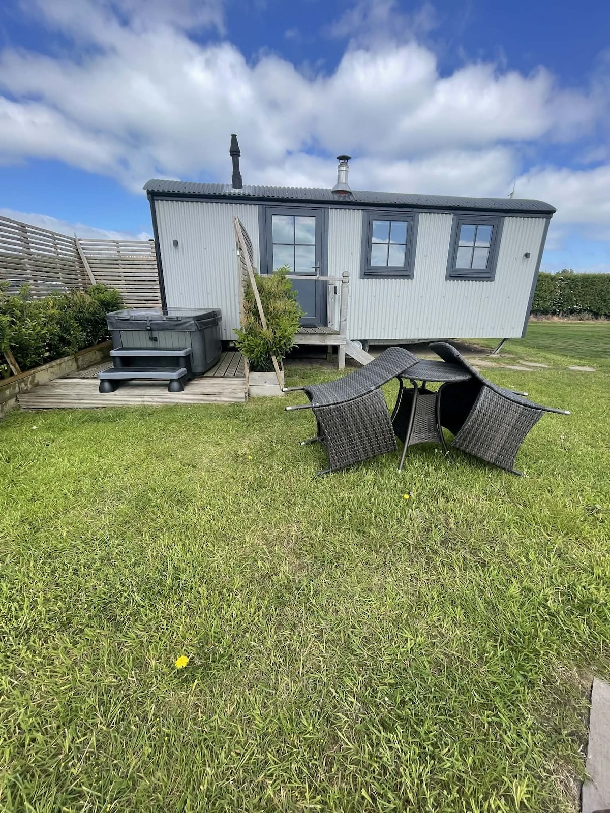 Ven y quédate en nuestra cabaña de pastores de hojalata bellamente terminada en el fondo de nuestro jardín. Estamos ubicados en el campo ondulado con amplias vistas sobre el valle de York. Después de un día explorando este AONB, no hay nada como cocinar té sobre la fogata o el horno de pizza de pellets de leña seguido de un chapuzón bajo las estrellas en nuestro jacuzzi rústico. Entra en una cama limpia y fresca y despierta con el sonido del coro del amanecer. ¡Nuestro granero de baño ofrece todas tus necesidades para refrescarte por la mañana!Hasta pronto.