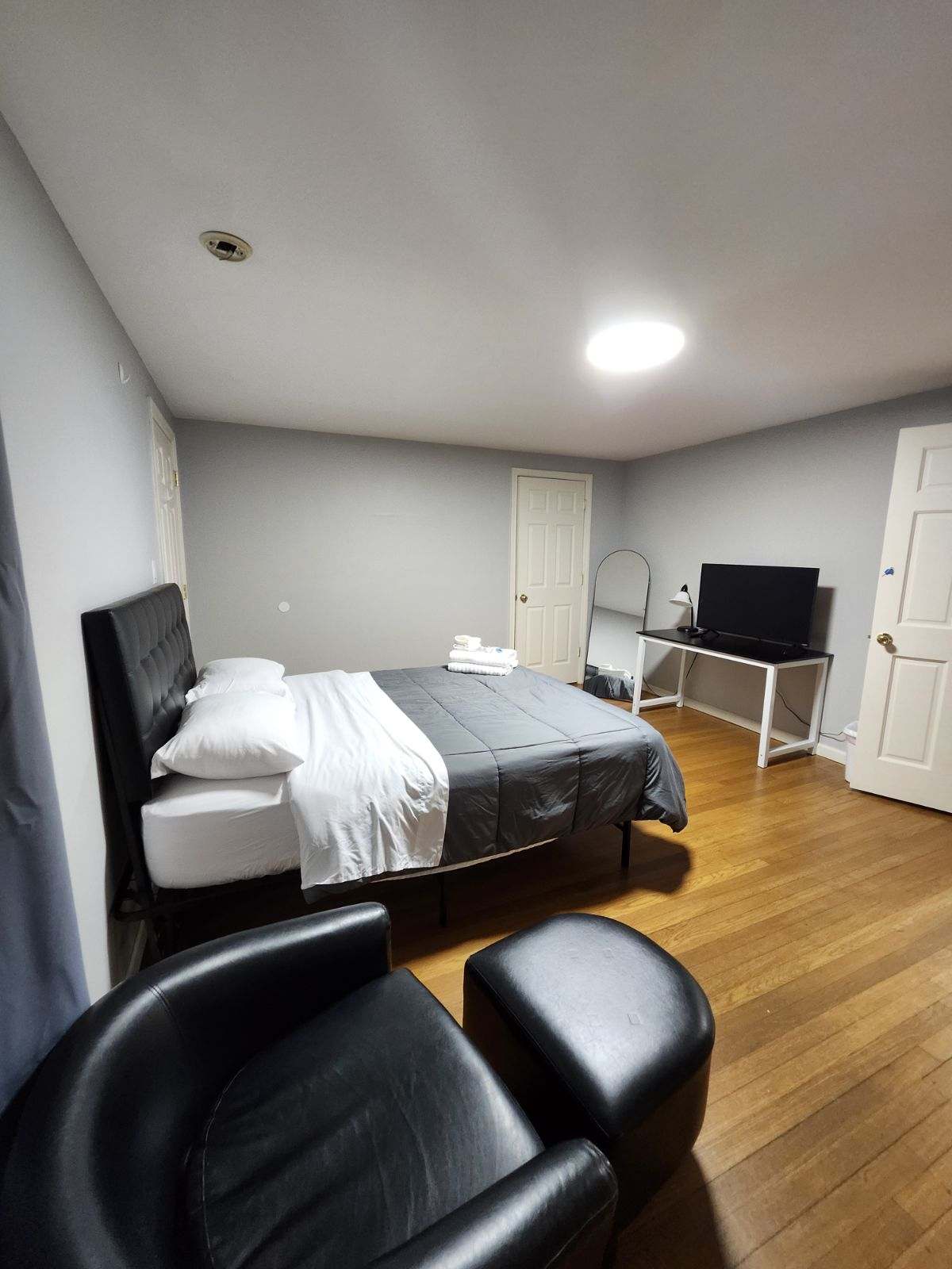 Suite privada recientemente renovada ubicada en el sótano con entrada privada y baño. La cama tamaño king tiene capacidad para 2 personas. Lámparas inteligentes y sillón reclinable de sofá eléctrico para mayor comodidad. Área de refrigerio ligero con microondas, nevera, mini tostadora, hervidor eléctrico y Keurig. Cerca del hospital Northwell y a 20 minutos a pie de la estación de tren LIRR. A 10 minutos en auto de todos los supermercados, tiendas, biblioteca y Stepping Stone Park. El anfitrión es muy alérgico a gatos y perros. ¡No se permiten mascotas!