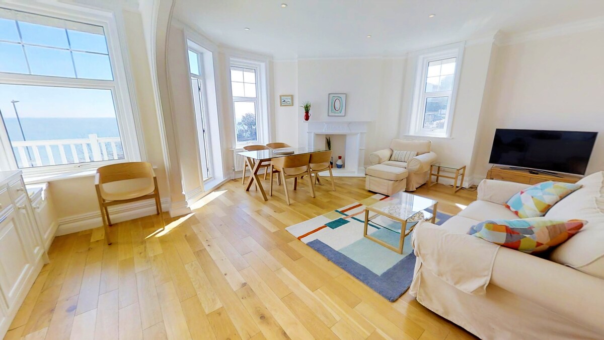 Un apartamento precioso y espacioso con techos altos y vistas espectaculares al mar en el paseo marítimo de St Leonards, cerca de una gran cantidad de cafeterías y restaurantes. Una sala de estar de planta abierta con chimenea de época, cocina totalmente equipada, baño elegante y precioso dormitorio. Persianas opacas instaladas para un buen descanso nocturno.