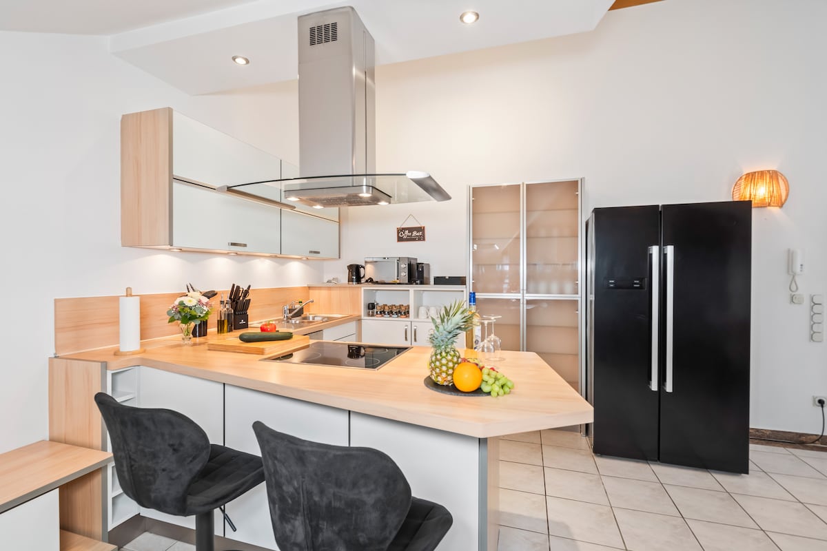 Disfrutá de un espacio para hasta 4 personas en la planta superior de unos 70 m²: dos dormitorios con cómodas camas dobles, una impresionante altura de techo de 5,20 m y una fachada acristalada con vistas panorámicas de Fulda, Frauenberg y el Rhön. La cocina totalmente equipada, un salón acogedor con TV inteligente de 65" y un baño de lujo con ducha con efecto de lluvia garantizan la comodidad. Relajate en el balcón cubierto o en la sauna. Con paneles fotovoltaicos, estacionamiento y estación de carga para bicicletas eléctricas.