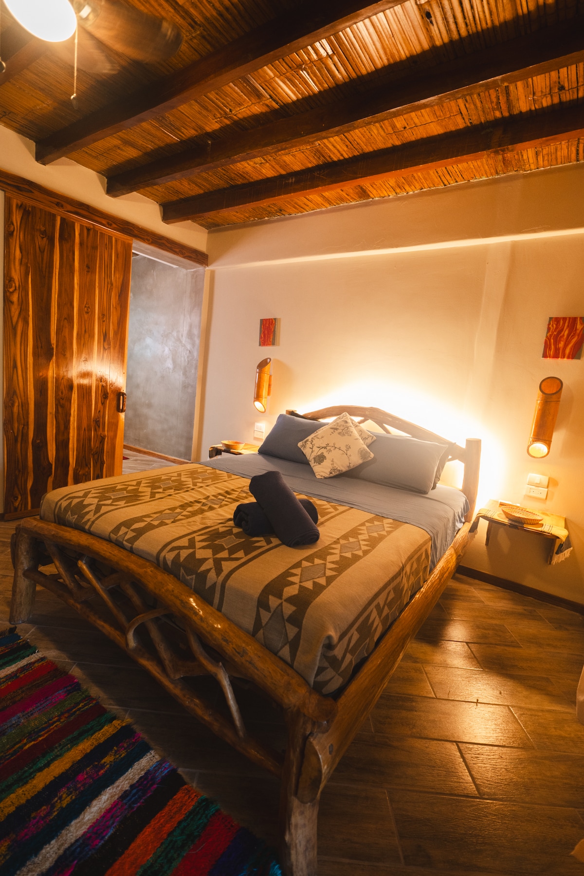 Double Bed Room ( queen bed and single bed) with balcony. Mama Tungu is a hostel located between the Chamana, Ulba and El Silencio waterfalls, with trails and viewpoints just steps from the hostel where you can enjoy Baños and its magic. Shared and private rooms. Rest Bar, indoor and heated swimming pool and jacuzzi. Giant Hammock, Tree House and more for you to spend incredible days. Mama Tungu Bar and rest will surprise you with its proposals.