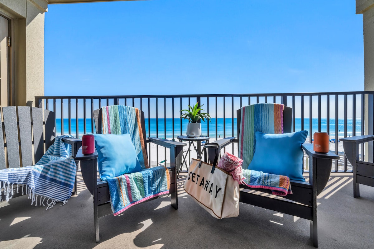 Nestled on shimmering Gulf shores, The Palms #201 invites you to unwind with jaw-dropping oceanfront views. This 2-bed, 2-bath sanctuary is your ticket to an unforgettable coastal retreat. Steps from the water, this guest favorite blends relaxation and rejuvenation for a home-away-from-home feel. From March through October, we provide complimentary beach service with two chairs and umbrella—a $40 daily value included free! Pure paradise is at your doorstep. Book this dream coastal escape today!!