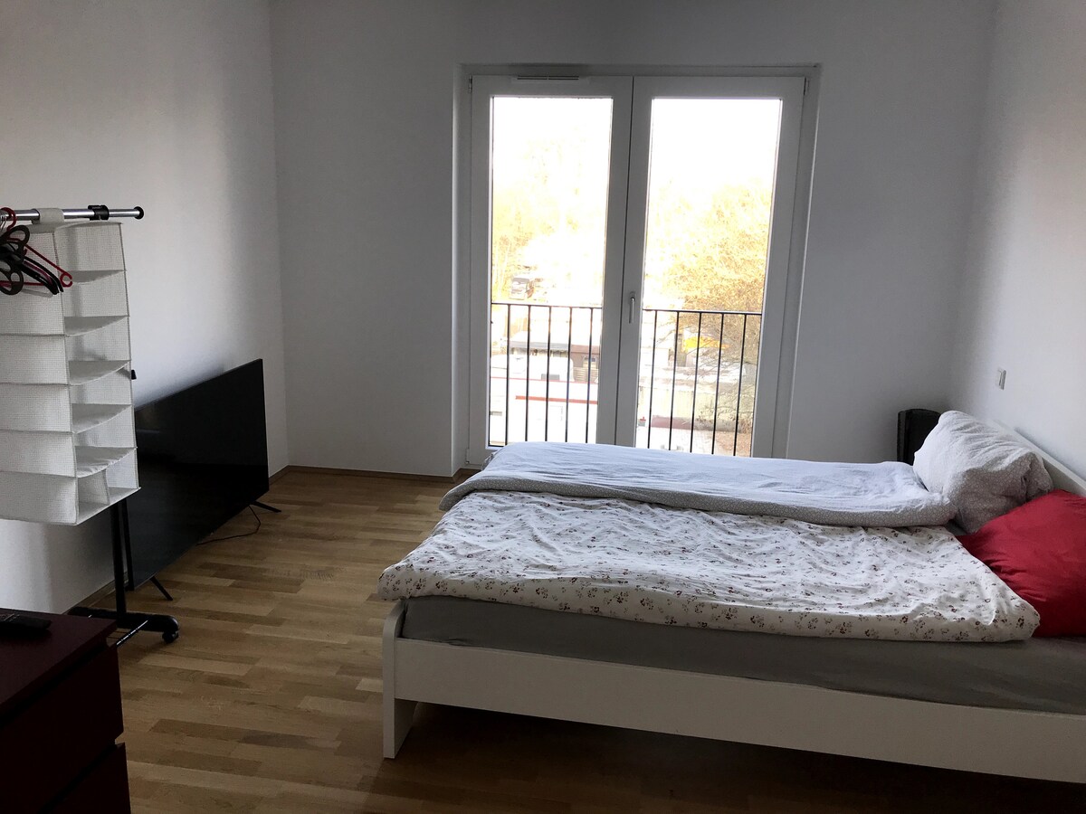 Luminoso apartamento de una habitación de 32 m², balcón, wifi, televisión, reproductor de DVD. Cocina con fregadero, cocina, nevera. Baño con ducha, lavabo y WC. Recibidor con guardarropa y armario empotrado. Ventana/puerta del balcón con persianas y cortina/persianas venecianas. Apartamento en el 2º piso de un edificio de apartamentos, ascensor. Sótano/espacio para guardar bicicletas. Distancia a la parada de tranvía aprox. 300 m, 4 paradas desde la estación central. Supermercado, panadería y lavandería cerca.