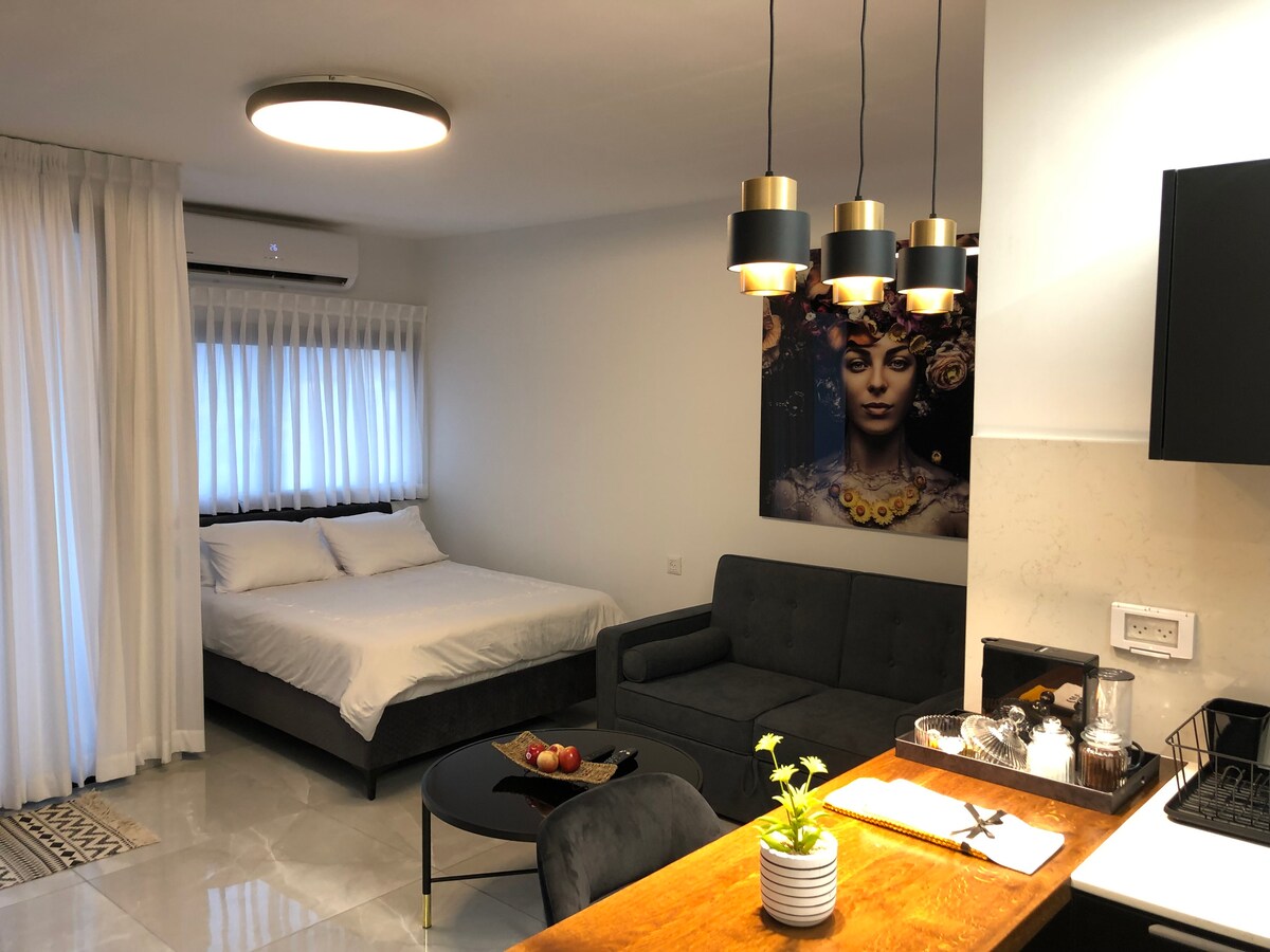 Boutique Suite Tel Suite de 32 metros decorada e invertida. +Balcón con vistas a la ciudad. Y las montañas de Eilat. Cocina totalmente equipada con todo. Hasta una máquina de café expreso. Wifi. Alto nivel de limpieza. Hay un supermercado debajo de un condominio y un antiguo restaurante de comida casera llamado Gakenis. Distancia a pie al mar a 10 minutos (1 km) Distancia a la ciudad 500 metros. Estacionamiento gratuito debajo de un apartamento. Hospeda con amor 💛 Suite boutique Tel