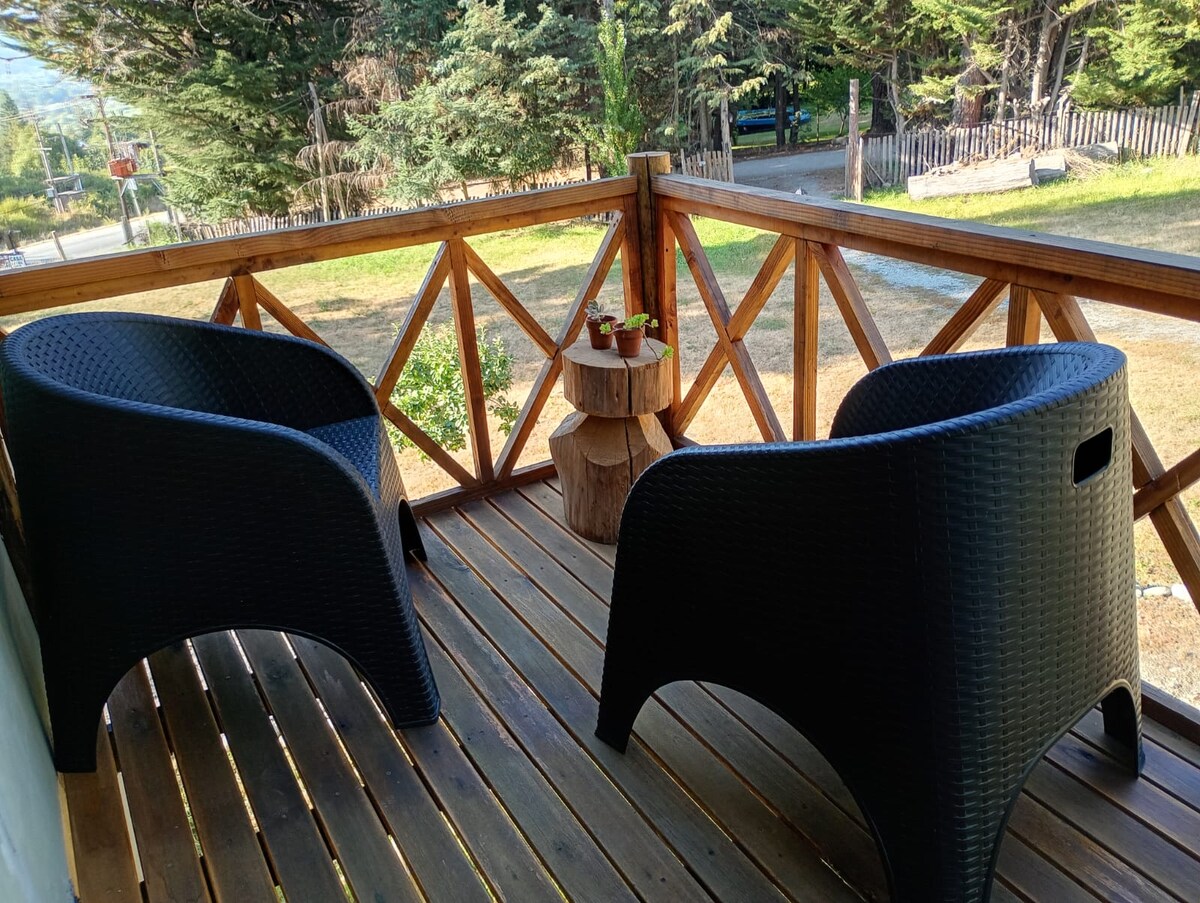 Departamento completo en villa turística. Perfecto para parejas. Estamos en la ruta nacional n.° 16, a un kilómetro del Parque Nacional Lago Puelo y a un kilómetro del centro de la ciudad de Lago Puelo. El apartamento tiene un jardín completo con hermosas vistas a las montañas que nos rodean. Cuenta con cocina comedor equipada, habitación matrimonial y baño privado.