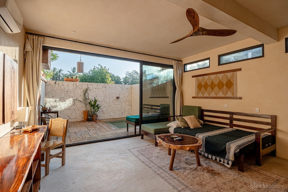Ubicada en Nido Escondido, esta unidad más grande de la primera planta ofrece un patio privado con piscina de inmersión, sala de estar con sofá cama, dormitorio tamaño king y baño completo. A solo 2 minutos a pie de la playa, a 10 minutos a pie de la zona de La Punta y a 15 minutos a pie de la zona de Zicatela. Disfruta de la azotea comunitaria con piscina infinita con vistas al mar, mesa de billar, zonas de estar, cocina y barbacoa. Incluye 2 unidades de aire acondicionado, agua caliente, sábanas de alta gama, toallas, jabones, café y un anfitrión con recomendaciones personalizadas.