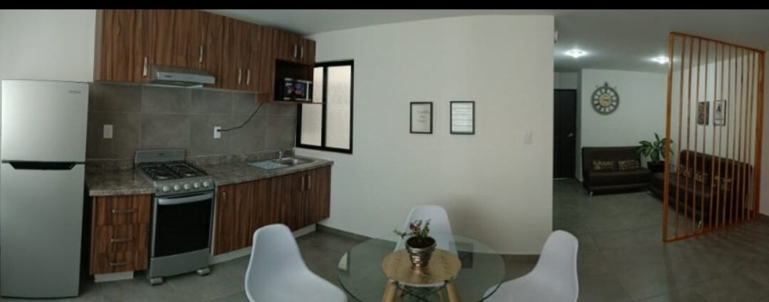 Disfruta de la comodidad de este Departamento tranquilo acogedor y céntrico. Se encuentra a unos pasos de la carretera a Matehuala sobre una avenida principal con accesos rápidos. Cerca encontraras: farmacias, centros comerciales, gasolineras, restaurantes, puestos de comida y enfrente un Oxxo. A 10 minutos de distancia llegarás al centro histórico, a 7 minutos a la terminal Terrestre y a 15 minutos al Aeropuerto internacional de San Luis Potosí.