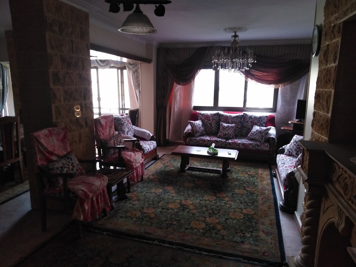 Beautifully designed luxury apartment . Private floor 2400 sq ft . A perfect getaway for family/individuals looking for neat well furnished stay in Ard El Golf- Heliopolis Cairo. A panoramic garden view along with sunshine specious area served with fully air conditioning (cold and heat). Inspired high standard amenities. Welcoming neighborhood. Metro station is 8 mints walking distance, Famous shopping malls and groceries are quite near. All over, nothing is better than a unique safe location.