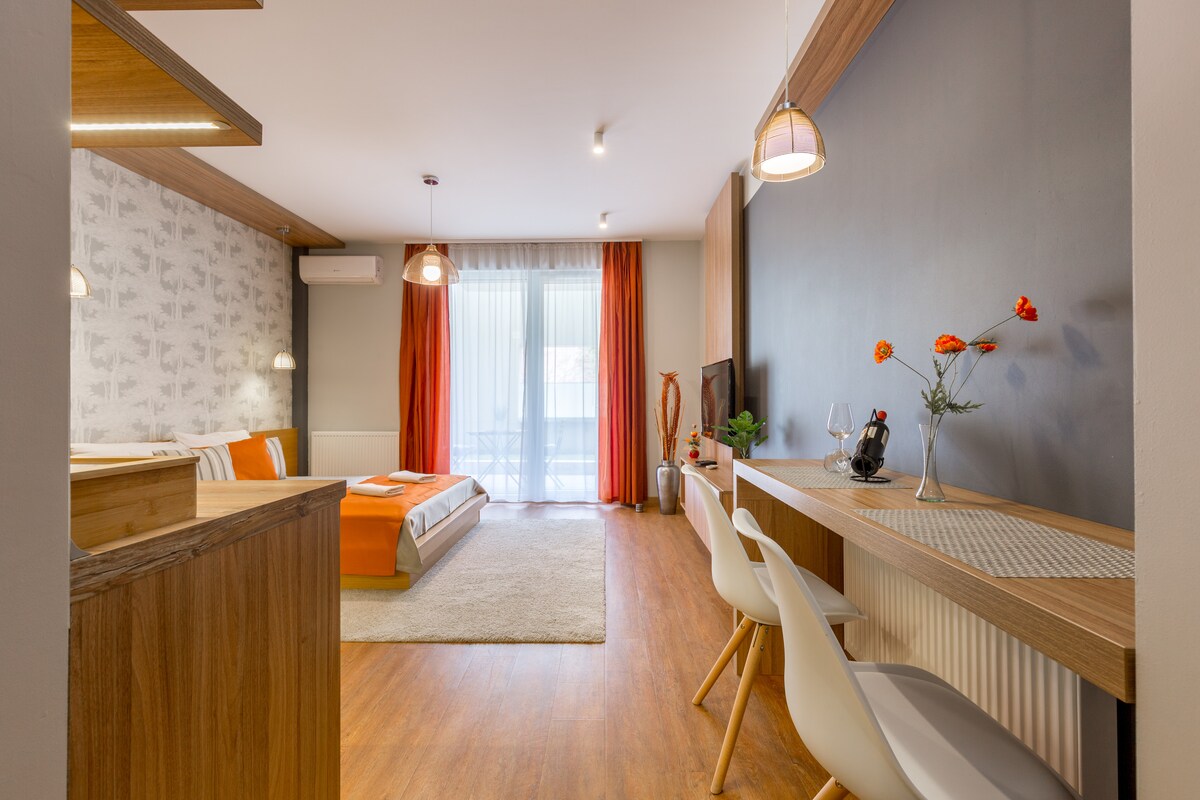 Moderno estudio con gran ducha. Te damos la bienvenida con café y té, una cocina muy bien equipada y una cómoda cama doble. Smart TV de pantalla grande con más de 50 canales húngaros e internacionales, internet rápido y una rica oferta de programas para ayudarte a quedarte aquí. Acceso: ¡todo el departamento es tuyo con una gran terraza verde!