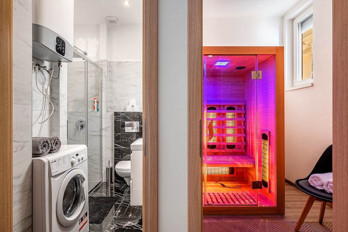 Looking for a relaxing home in Budapest? You’ve just found it! Unwind in your private Sauna with LED lights and music, the perfect way to relax after a long day exploring the city. The place is cozy, modern, and fully equipped for a comfortable stay: a kitchen with everything you need (even a dishwasher) comfortable queen-size bed, wardrobe, and a stylish sofa bed. The bathroom has a spacious shower and a washing machine for your convenience. During the summer, air conditioning keeps you cool.