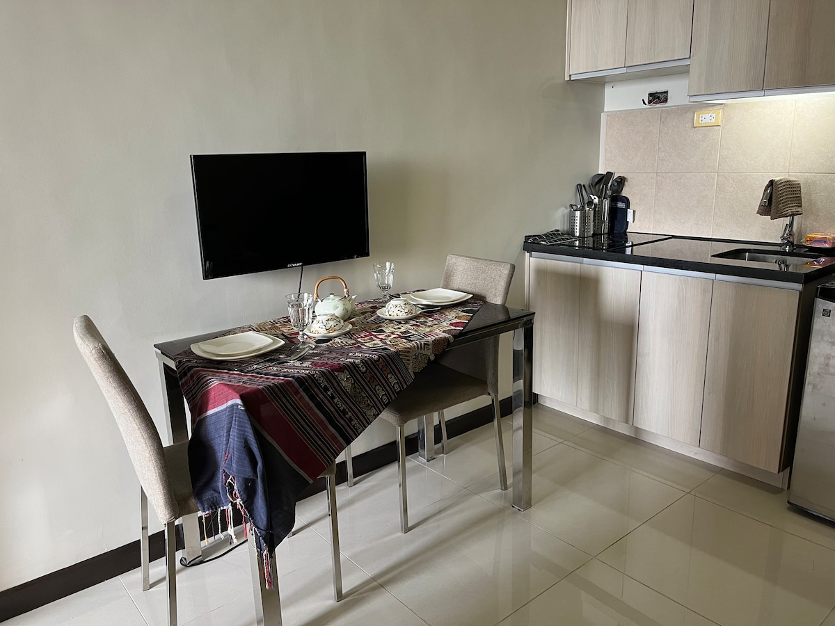 ¡Despierta con unas impresionantes vistas de la ciudad en este moderno condominio de gran altura totalmente equipado! Una unidad moderna, limpia y cómoda ubicada en el corazón de la ciudad, cerca de todas las atracciones y todas las formas de transporte, a 2 minutos a pie del centro comercial Robinsons con docenas de numerosos restaurantes y patio de comidas. El condominio está amueblado con colchón de lujo tamaño queen, con cocina y aplicación conveniente con televisión Android de 43 pulgadas con Netflix y lavadora en la unidad, agua fría y caliente para la ducha.
