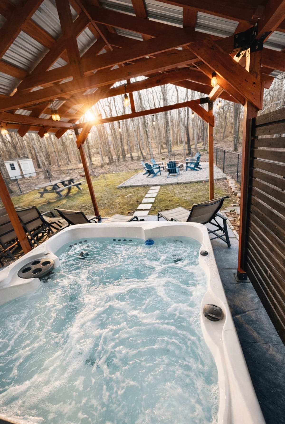 A truly unique stay in the Pocono Mountains, home to rolling mountain terrain, breathtakingly beautiful waterfalls, thriving woodlands, + 170 miles of winding river. Created with the “ultimate night in" themed experience, guests can sip wine under the stars in a private hot tub, + enjoy movies on their own 135" movie screen equipped w/ the world's first LED 4K gaming projector. Enjoy themed bedrooms and experience a stay where the forest takes you away as you stay in ultimate comfort + luxury.