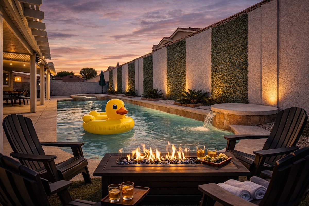 Características de la casa: área privada de pileta y jacuzzi en el patio trasero. Juegos al aire libre: ping-pong, Connect Four & Corn Hole. fogata. Barbacoa y comedor al aire libre. Internet rápido. Cocina y lavadero completamente equipados. Duchas a pie y dormitorio de abajo. Todas las habitaciones tienen televisores con streaming Roku. Barrio bastante seguro. Ubicado a 3,9 millas del aeropuerto, a 7 millas de MGM Grand en The Strip. ¡A 5 minutos en auto del casino Green Valley Ranch, tiendas y restaurantes! * La piscina no tiene calefacción. ¡Jacuzzi climatizado todo el año!