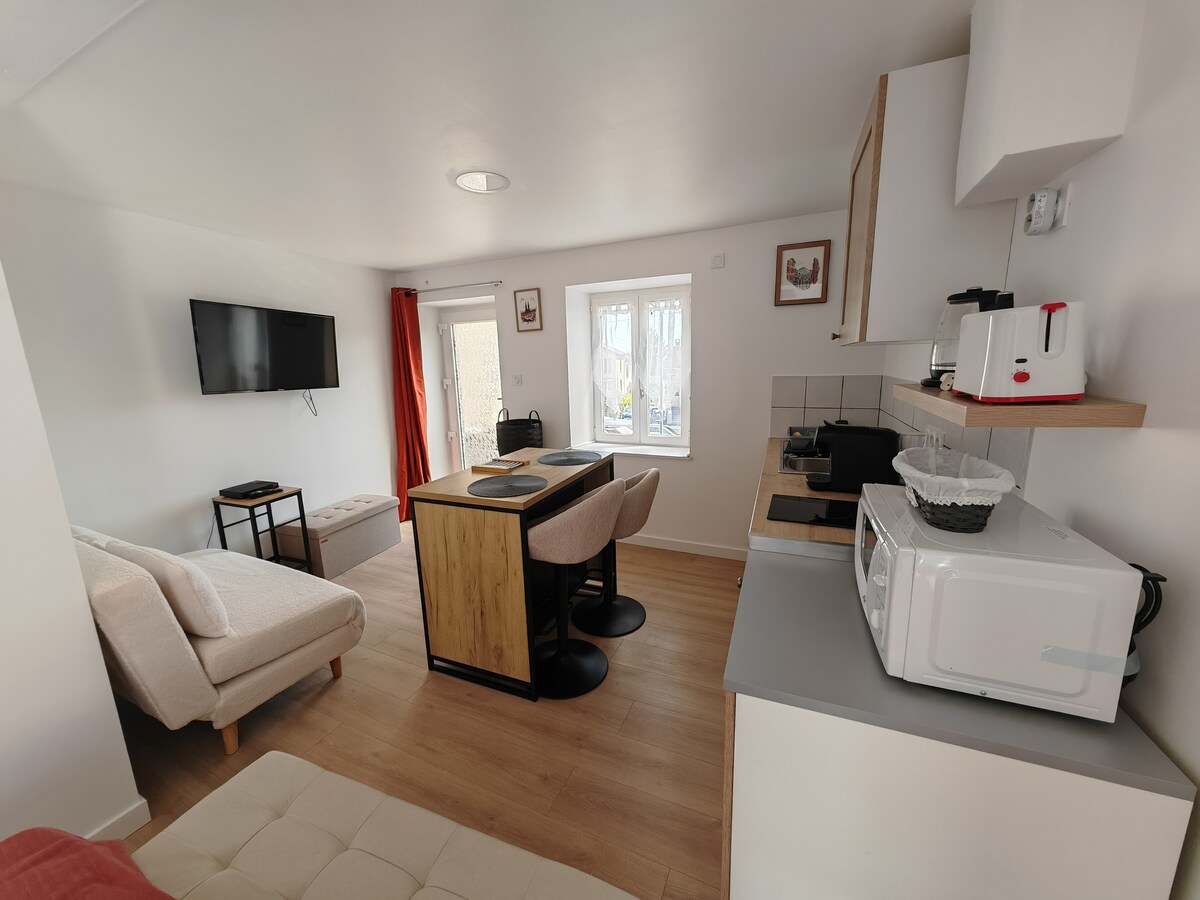 Estudio de 20 m² (casa de pueblo con plaza de aparcamiento) completamente renovado en 2024 con cocina, baño, televisión, internet, cama. Ideal para los huéspedes (situado a 8 minutos de las termas de Châtel-Guyon) y también para descubrir Auvernia (a pie de la cadena de los puys) y Clermont-Ferrand (a menos de 20 minutos).