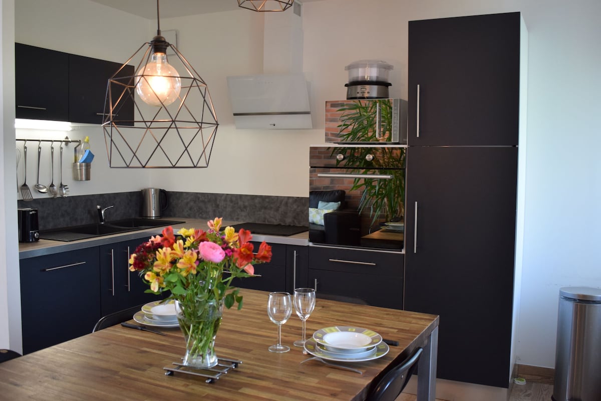casa hermosa decoración . Planta baja: comedor , cocina ,lavandería lavadora,Wc .En la planta: un dormitorio con cama grande (160x200),un dormitorio con dos camas . 1 cama individual (90x190) y una cama doble (140x190) un baño . las camas están hechas a su llegada .frente a la casa espacio de relajación de 85m2. Con piscina cubierta (natación a contracorriente, aqua bike), jacuzzi, sauna, hamman 2 h gratis por noche reservada