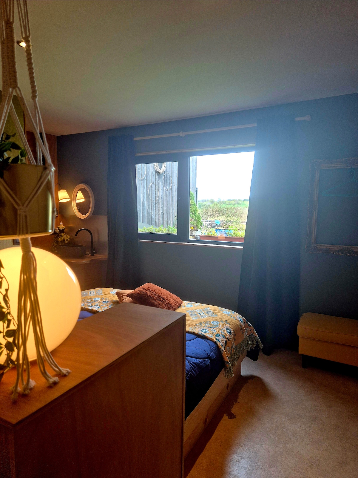 Je logeert in een ruime kamer met een prachtig zicht op de glooiende heuvels van Erezée. De ruimte is voorzien van een tweepersoonsbed (160x200cm), douche met lavabo, een aparte WC, een kleine keuken met kookfornuis, oven, koelkast, microgolf, senseo-apparaat, waterkoker, broodrooster, ... Bedlinnen, bad- en keukenlinnen, schoonmaak zijn inbegrepen. Ontbijtmand optioneel - beschikbaar vanaf juli 2026!