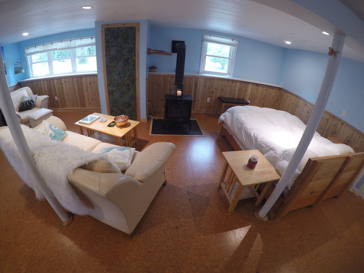 Recién remodelado con entrada independiente al primer nivel de una casa de campo elevada. Baño privado, cama tamaño queen y sala de estar. Hay almohadas de plumón y edredón en la cama. Zona de comedor con mesa y sillas, microondas y nevera. Calentado por una estufa de gas. Estamos a 10 minutos en coche de Burlington y a 10 minutos a pie de Bayside Beach y Park, con canchas de tenis iluminadas y playa. Hay una tienda de comestibles/licorería a 5 minutos a pie. No se admiten mascotas debido a alergias graves en un miembro de la familia.